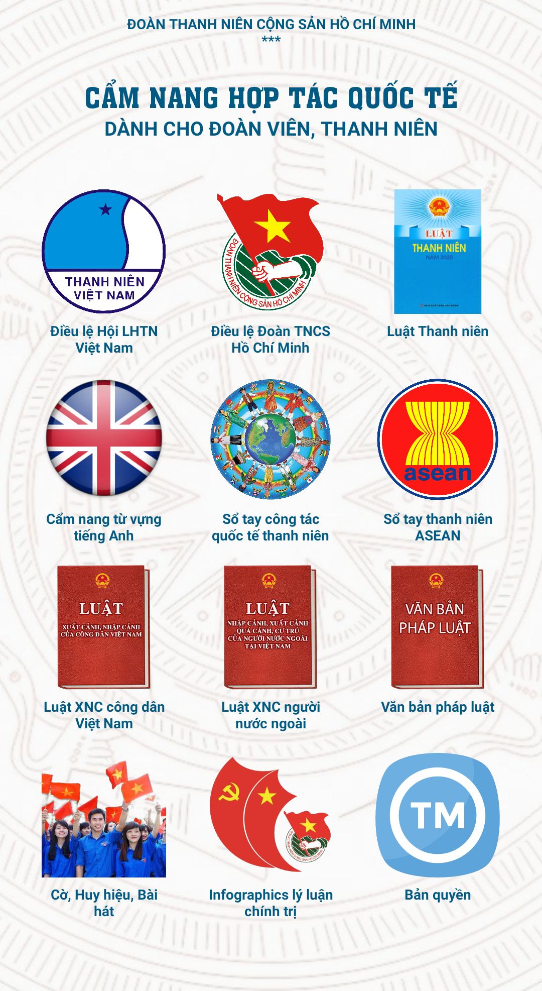 - Các văn bản về hợp tác quốc tế do Ban Quốc tế Trung ương Đoàn xây dựng: (1) Cẩm nang từ vựng tiếng Anh; (2) Sổ tay công tác quốc tế thanh niên; (3) Sổ tay thanh niên ASEAN.