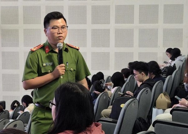 Thượng úy Châu Đức Nhân hướng dẫn sinh viên cách nhận diện các tình huống lừa đảo có thể gặp phải