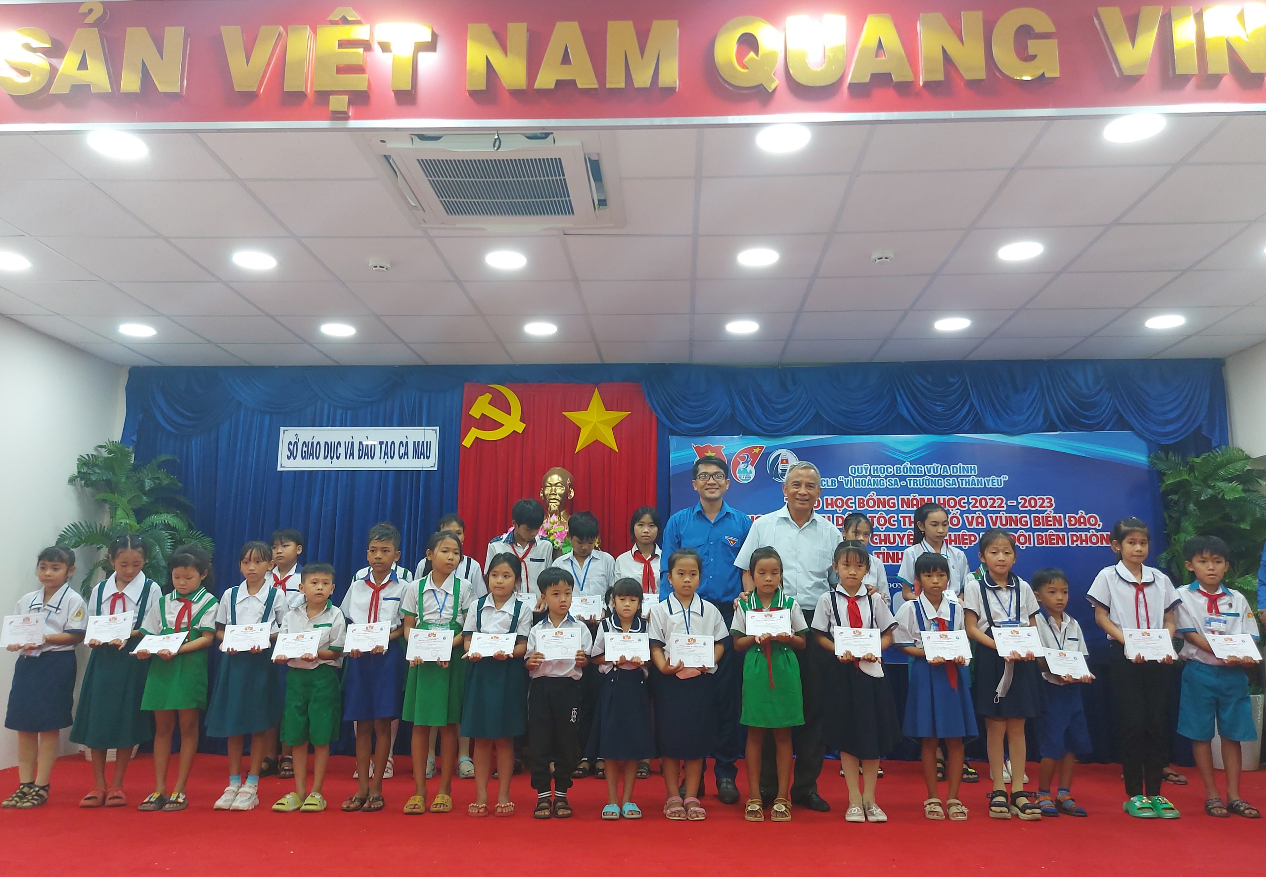 Đồng chí Trần Đăng Khoa, Phó Bí thư Tỉnh đoàn Cà Mau và đồng chí Đặng Ngọc Tùng, Phó Chủ nhiệm CLB "Vì Hoàng Sa - Trường Sa thân Yêu” trao tặng 100 suất học bổng cho con em ngư dân có hoàn cảnh khó khăn.