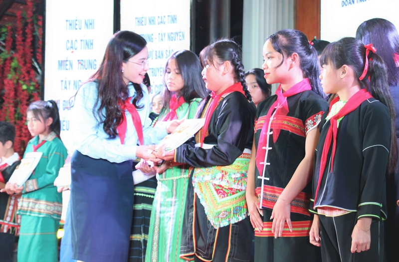 Đồng chí Nguyễn Phạm Duy Trang - Bí thư T.Ư Đoàn, Chủ tịch Hội đồng Đội T.Ư tặng học bổng và sách cho các em thiếu nhi dân tộc có hoàn cảnh khó khăn