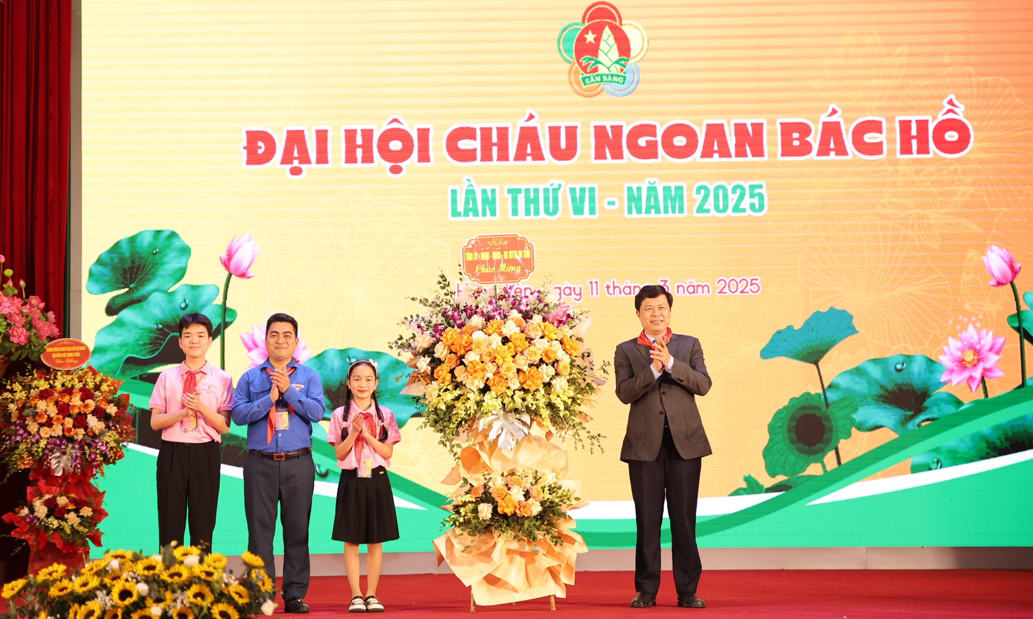 Đồng chí Nguyễn Phạm Duy Trang, Bí thư Trung ương Đoàn, Chủ tịch Hội đồng Đội Trung ương trao tặng lẵng hoa chúc mừng Đại hội Cháu ngoan Bác Hồ tỉnh Hưng Yên lần thứ VI, năm 2025