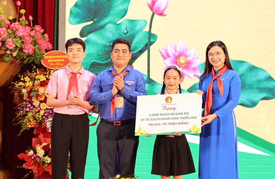 Đồng chí Nguyễn Phạm Duy Trang, Bí thư Trung ương đoàn, Chủ tịch Hội đồng Đội Trung ương trao tặng 2000 khăn quàng đỏ và 01 tủ sách dành cho thiếu nhi tỉnh Hưng Yên tại đại hội