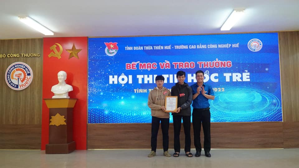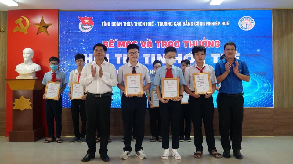 Đồng chí Nguyễn Thanh Hoài - UVBCH Trung ương Đoàn, Bí thư Tỉnh Đoàn, Chủ tịch Hội LHTN Việt Nam tỉnh trao giải Nhất bảng thi D3 cho các em Nguyễn Duy Bảo Tường, Hồ Hữu Minh Nhật, Bùi Văn An Huy - Lớp 12 Tin, trường THPT Chuyên Quốc học Huế với tên đề tài “Xây dựng Website Quản lý điểm rèn luyện cho học sinh THPT”