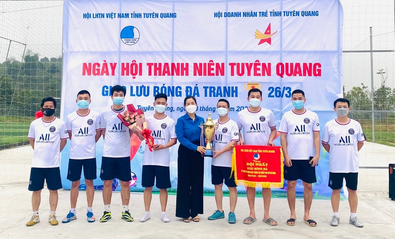 Lãnh đạo Tỉnh đoàn trao cúp cho đội đạt giải 1 tại Giải giao lưu bóng đá kỷ niệm 91 năm Ngày thành lập Đoàn