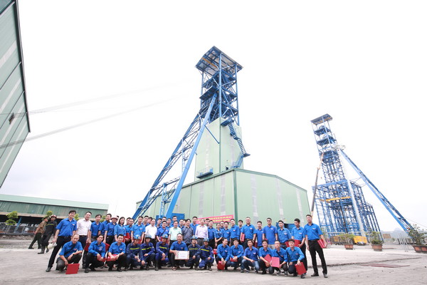 Đoàn đại chụp ảnh lưu niện cạnh tháp giếng đứng tại khai trường sản xuất.