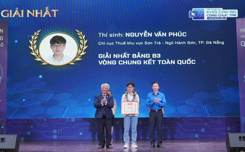 Đồng chí Nguyễn Minh Triết - Bí thư Trung ương Đoàn, Chủ tịch Trung ương Hội Sinh viên Việt Nam, Trưởng Ban Tổ chức Hội thi và đồng chí Phùng Văn Ổn - Phó Chủ tịch Hội Tin học Việt Nam, Chủ tịch Hội đồng Giám khảo trao giải Nhất bảng B3