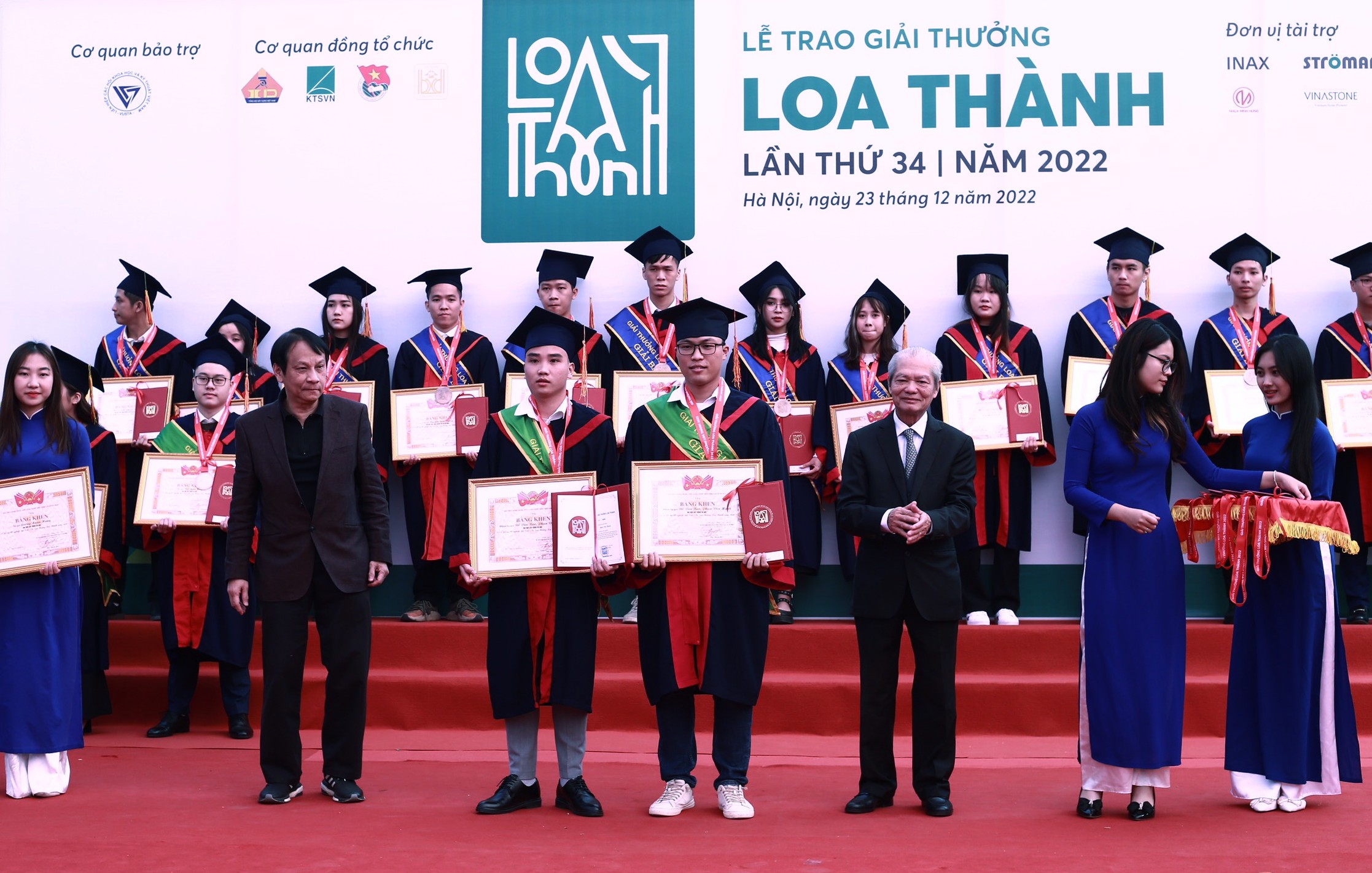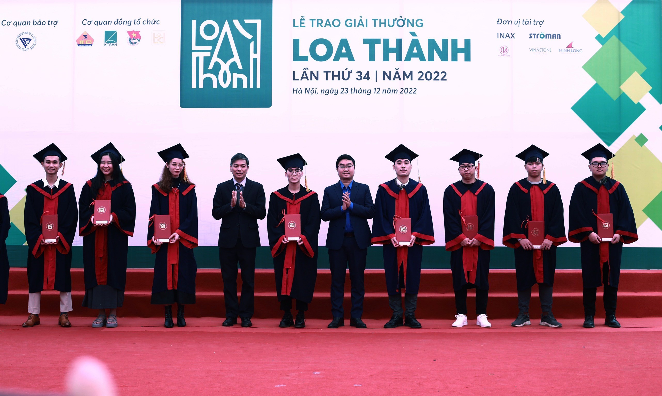 Đại diện Ban Tổ chức trao Giải thưởng Loa Thành năm 2022 trao giải nhì cho các sinh viên có đồ án xuất sắc tại buổi lễ.