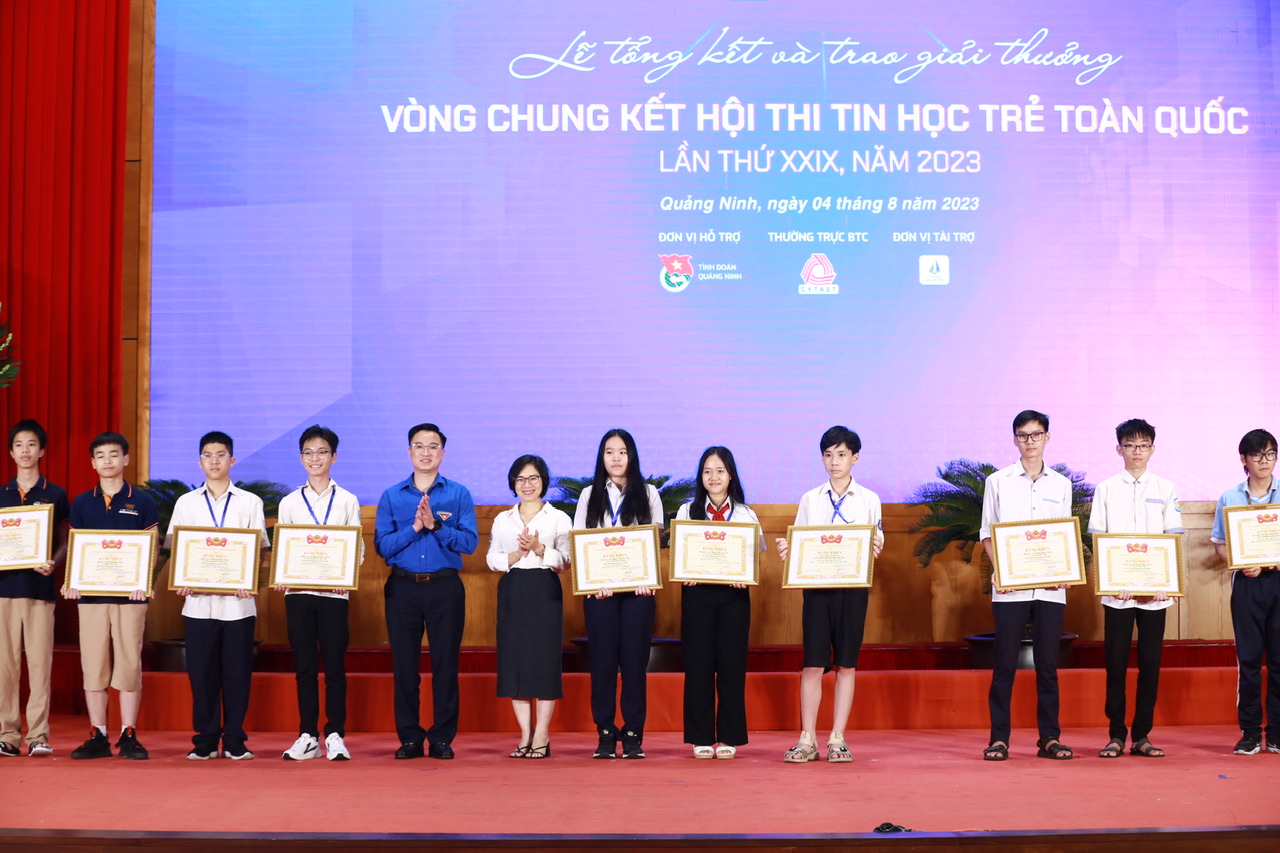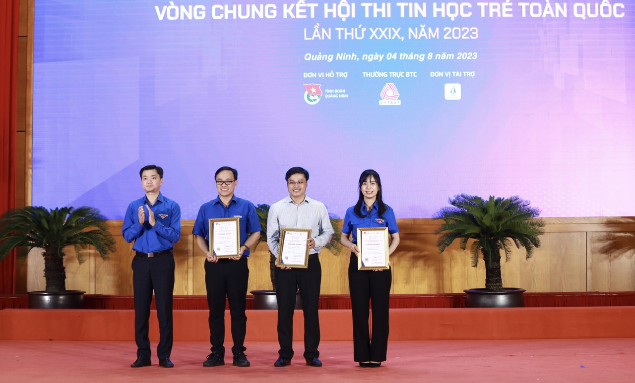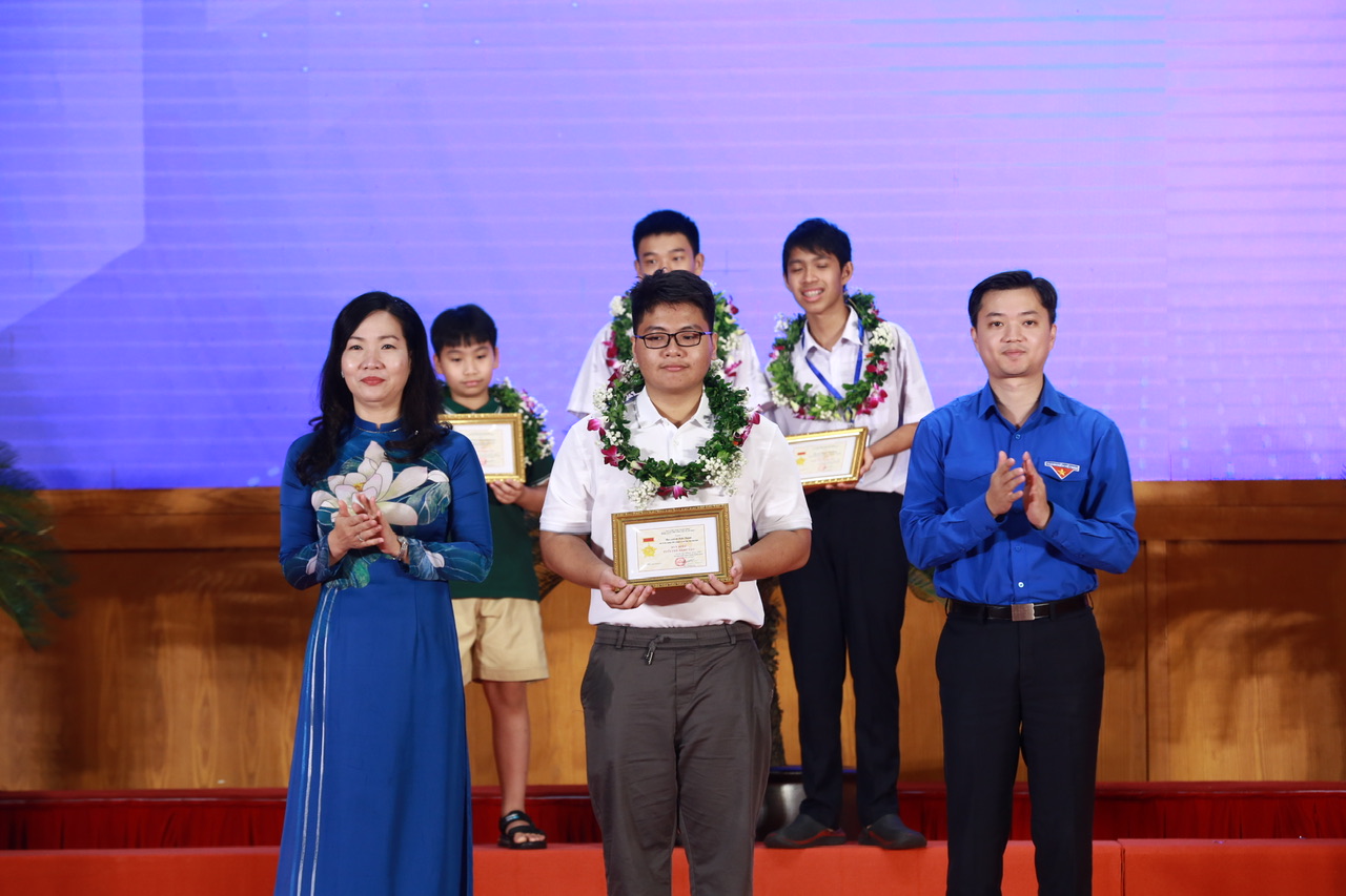 Đồng chí Hoàng Văn Hải - Ủy viên Ban Chấp hành Trung ương Đoàn, Bí thư Tỉnh đoàn Quảng Ninh và đồng chí Trần Hương Thảo – Phó Giám đốc Trung tâm Phát triển Khoa học, Công nghệ và Tài năng trẻ trao phần thưởng cho các thí sinh đạt giải Ba cuộc thi