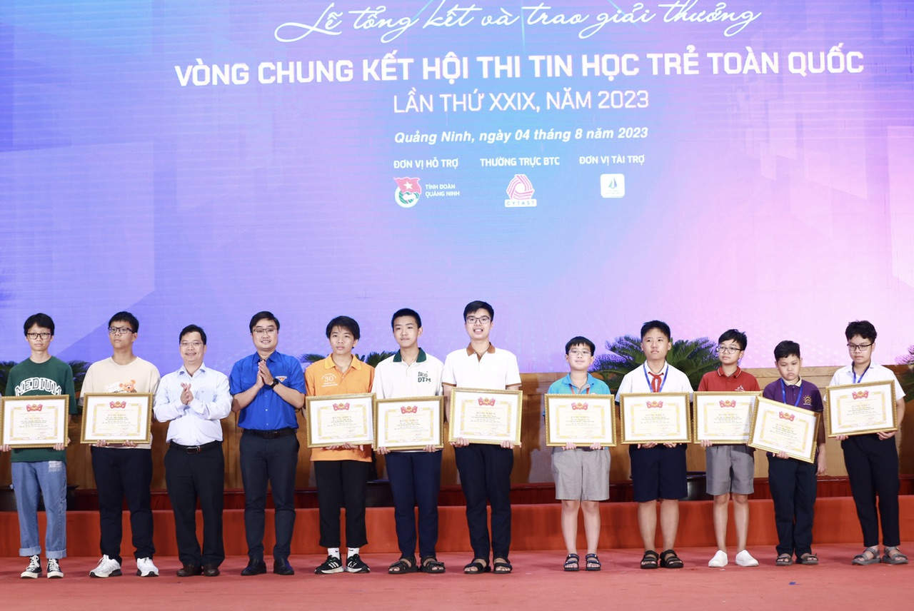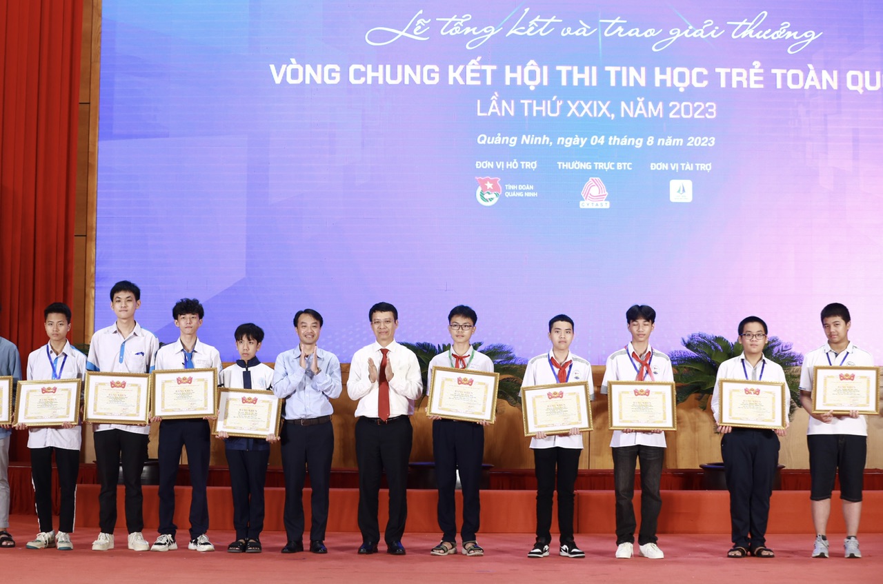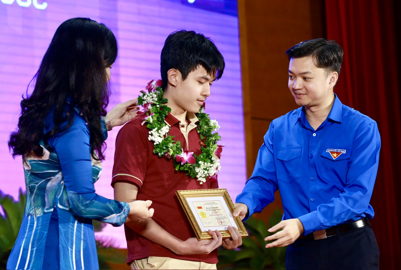 Đồng chí Hoàng Văn Hải - Ủy viên Ban Chấp hành Trung ương Đoàn, Bí thư Tỉnh đoàn Quảng Ninh và đồng chí Trần Hương Thảo – Phó Giám đốc Trung tâm Phát triển Khoa học, Công nghệ và Tài năng trẻ trao phần thưởng cho các thí sinh đạt giải Ba cuộc thi