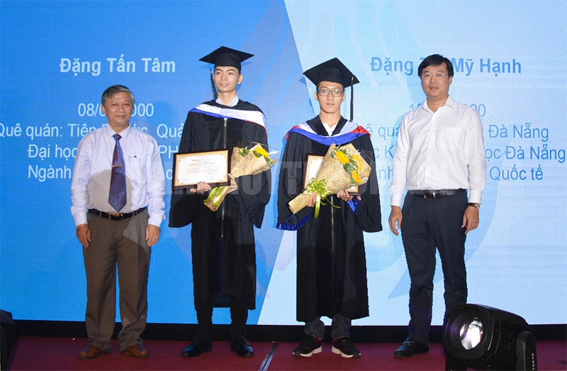 Đồng chí Lê Quốc Phong - Ủy viên dự khuyết Trung ương Đảng, Bí thư thứ nhất Trung ương Đoàn; Chủ tịch Hội LHTN Việt Nam, Chủ tịch Hội SVVN và đồng chí Đặng Mạnh Trung - Trưởng cơ quan đại diện Ban Tuyên giáo Trung ương tại TP Hồ Chí Minh trao học bổng cho các thủ khoa