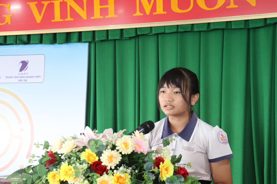 Thí sinh Võ Nguyễn Tú Anh – Học sinh lớp 5/1, trường Tiểu học An Thạnh thay mặt các thí sinh phát biểu tại Hội thi.