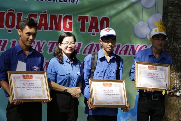 Đ/c Quang Lê Hồng Chuyên - Phó Bí thư Tỉnh Đoàn trao giải cho đội về đích trong cuộc thi đua xe mô hình