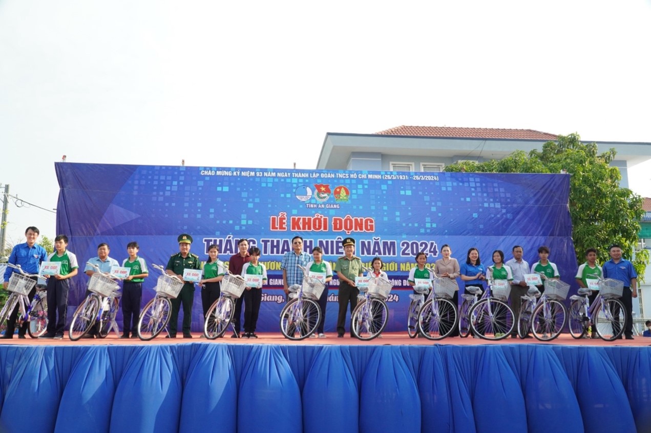 Tại buổi lễ, Tỉnh Đoàn đã trao các nguồn lực thực hiện công trình, phần việc với tổng giá trị ước tính trên 2,9 tỷ đồng, cụ thể: Hỗ trợ 02 cây cầu bê tông nông thôn, trị giá 1.250.000.000 đồng do Công ty cổ phần TMDV Thuận Phát An Giang hỗ trợ; Trao tặng 14.509 tuýp thuốc Berocca cho Hội thầy thuốc trẻ tỉnh và các Câu lạc bộ thầy thuốc trẻ toàn tỉnh, trị giá: 1.060.000.000 đồng; Trao tặng 10 xe đạp cho thiếu nhi vượt khó học tốt, trị giá: 15.000.000 đồng do Ban Thanh niên Công an tỉnh hỗ trợ; hỗ trợ 62 suất học bổng “Nâng bước em đến trường”, trị giá: 32.000.000 đồng do Đoàn thanh niên Bộ đội Biên phòng tỉnh hỗ trợ; Hỗ trợ 01 chuyến xe yêu thương, trị giá 10.000.000 đồng; Hỗ trợ 500 bao xi măng thực hiện các công trình trong Tháng Thanh niên, trị giá: 35.000.000 đồng do Công ty Cổ phần Xây lắp An Giang hỗ trợ; Hỗ trợ 500 túi gạo Lộc Trời cho các hoạt động an sinh xã hội, trị giá: 60.000.000 đồng; Trồng mới 50000 cây xanh; Trao tặng 05 phần quà cho Gia đình chính sách, trị giá: 5.000.000 đồng; Trao tặng 50 chai nhớt miễn phí cho thanh niên công nhân, trị giá: 5.000.000 đồng do Petrolimex An Giang hỗ trợ.