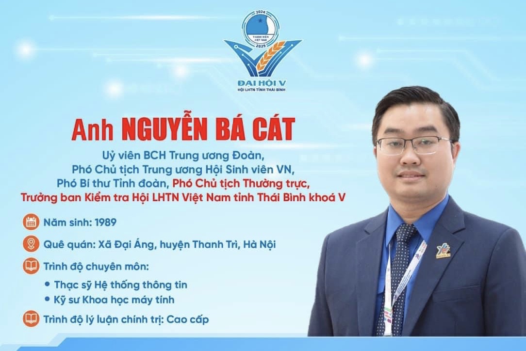 Anh Nguyễn Bá Cát - Ủy viên BCH Trung ương Đoàn, Phó Chủ tịch Trung ương Hội Sinh viên Việt Nam, Phó Bí thư Tỉnh Đoàn được tín nhiệm cử làm Phó Chủ tịch Thường trực, Trưởng Ban Kiểm tra Hội LHTN Việt Nam tỉnh Thái Bình khóa V, nhiệm kỳ 2024-2029.
