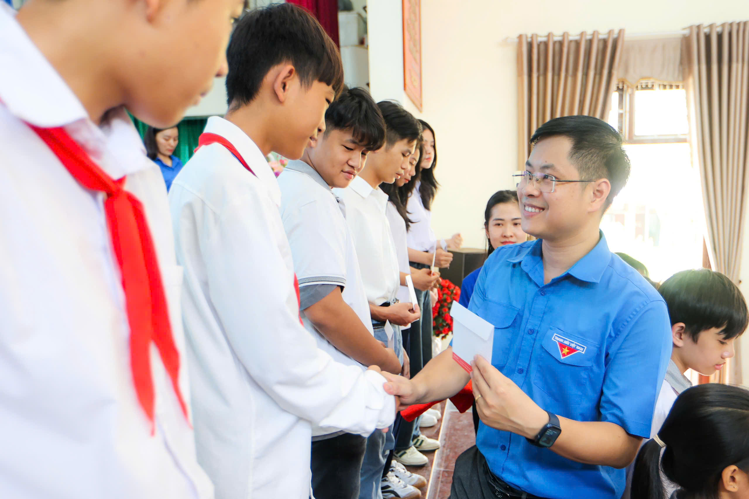 Đồng chí Giáp Xuân Cảnh, Phó Bí thư Tỉnh đoàn, Chủ tịch Hội đồng Đội tỉnh tặng quà cho các em học sinh tại chương trình