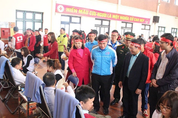 Các đại biểu thăm động viên đoàn viên, thanh niên và người dân tham gia hiến máu tình nguyện.