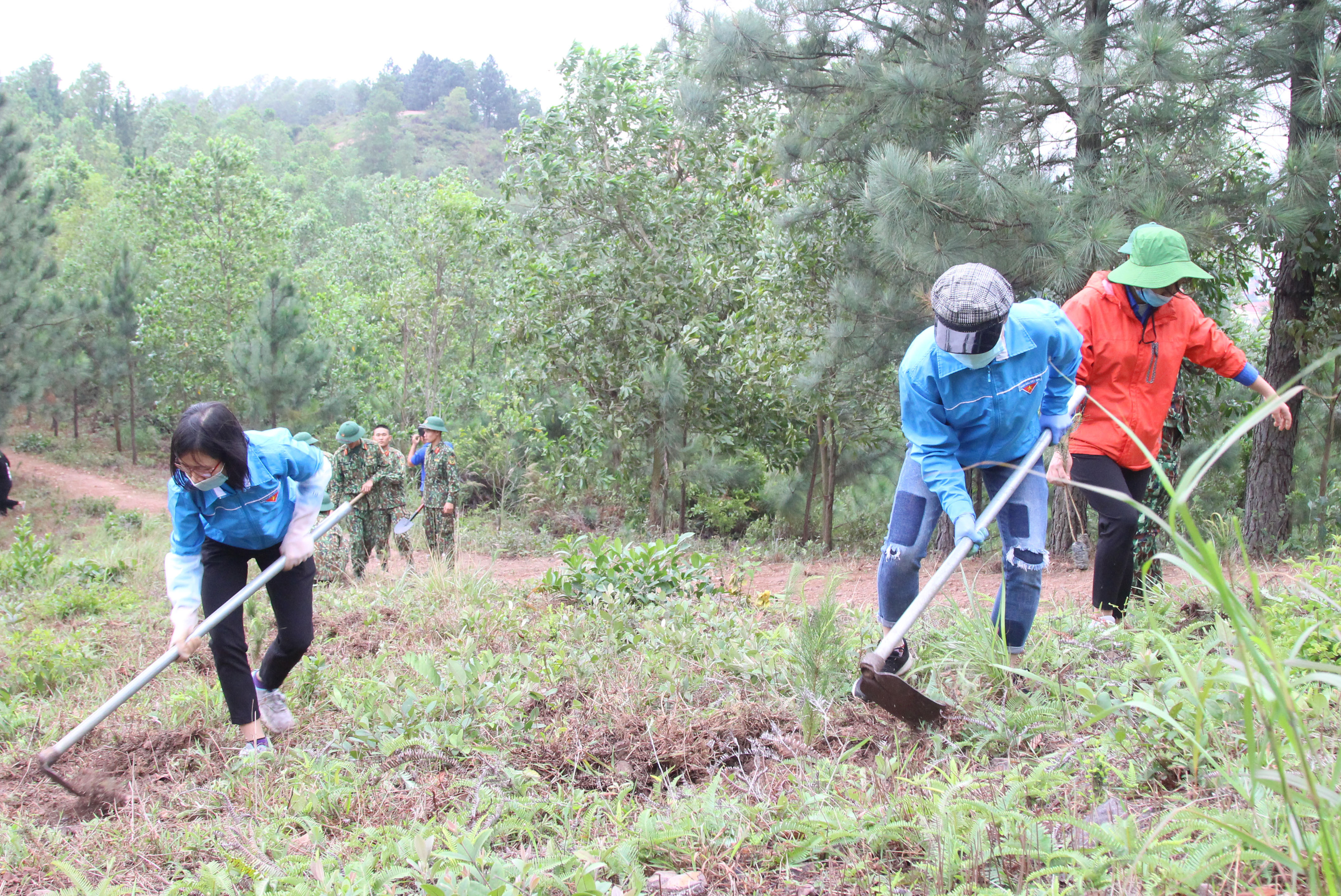 Dịp này các đồng chí đại biểu, cán bộ, chiến sĩ bộ đội cùng đoàn viên thanh niên đã chia thành các nhóm nhỏ và tham gia trồng cây thi công công trình “Vì một Nham Biền xanh” tại khu vực đường từ Thiền viện Trúc lâm Phượng Hoàng lên đỉnh Non Vua, thị trấn Nham Biền, huyện Yên Dũng.