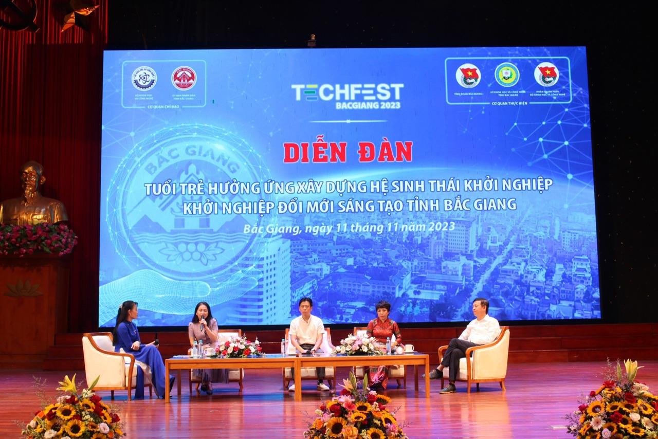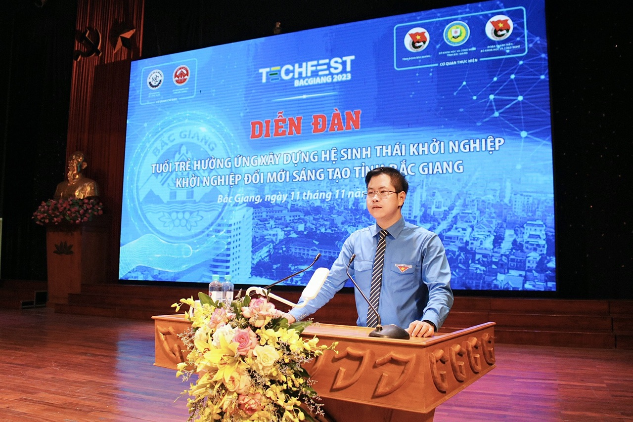 Phát biểu khai mạc, đồng chí Giáp Xuân Cảnh, Phó Bí thư Tỉnh đoàn, Chủ tịch Hội đồng Đội tỉnh, thành viên Ban Tổ chức sự kiện Techfest Bắc Giang 2023 nhấn mạnh: Thời gian qua, Tỉnh đoàn Bắc Giang đã tích cực triển khai các giải pháp nhằm đẩy mạnh phong trào khởi nghiệp ĐMST trong thanh niên, học sinh, sinh viên. Cụ thể như tham mưu cho UBND tỉnh triển khai chương trình tín dụng ưu đãi hỗ trợ thanh niên khởi nghiệp; đến nay tổng dư nợ gần 16 tỷ đồng, giải ngân cho 144 dự án vay vốn. Các huyện, TP bố trí nguồn kinh phí hỗ trợ các mô hình khởi nghiệp của thanh niên. Tính đến tháng 10/2023, Đoàn thanh niên toàn tỉnh đang quản lý 324 tổ tiết kiệm và vay vốn với gần 12 nghìn hộ vay, tổng dư nợ hơn 678 tỷ đồng.