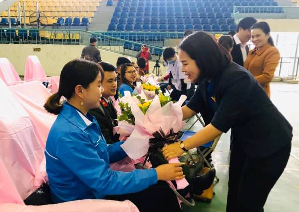 Đồng chí Ma Thị Mận - Phó Bí thư Tỉnh đoàn tặng hoa cho ĐVTN tham gia hiến máu tại Ngày hội