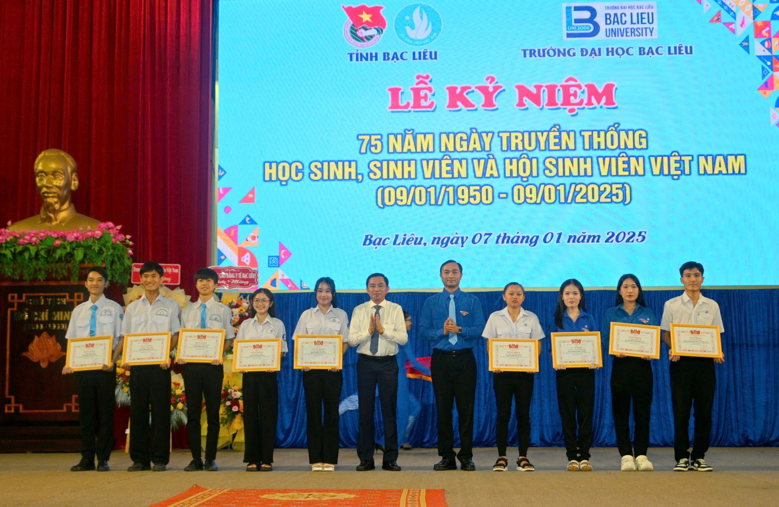 Tại buổi lễ Hội khuyến học tỉnh và Quỹ khuyến học Võ Văn Kiệt trao tặng 30 suất học bổng, mỗi suất trị giá 01 triệu đồng cho các bạn học sinh, sinh viên có hoàn cảnh khó khăn vượt khó vươn lên trong học tập và cuộc sống. Đồng thời, đại diện các nhà tài trợ (Hội Khuyến học tỉnh, Ngân hàng chính sách xã hội tỉnh, Ngân hàng Vietinbank chi nhánh Bạc Liêu, Công ty TNHH MTV Hồ Xuân Lành, Công ty TNHH Nam Đạt Bạc Liêu) trao bảng tượng trưng cho Hội Sinh viên Việt Nam tỉnh với tổng trị giá 60 triệu đồng. Kết thúc buổi Lễ, Ban Thường vụ Tỉnh đoàn cũng đã trao cờ đăng cai tổ chức hoạt động 09/01/2026 cho đơn vị Đoàn Trường Cao đẳng Y tế Bạc Liêu.