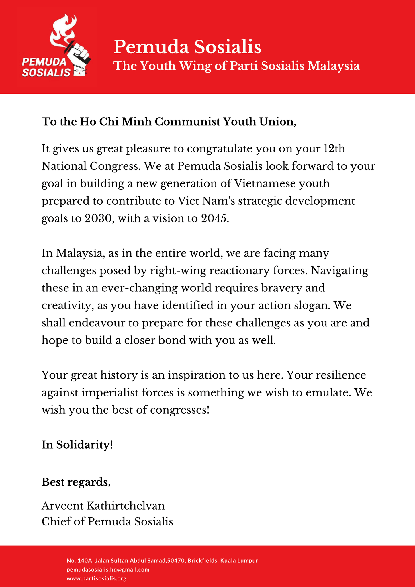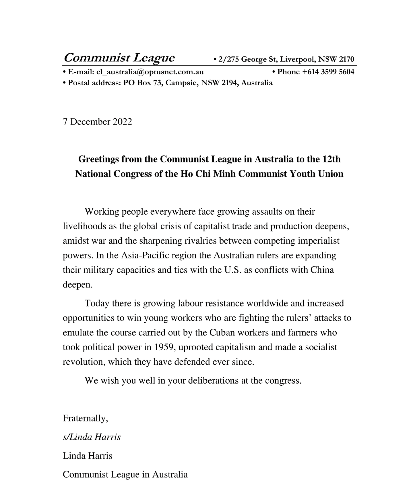 Đoàn Thanh niên Cộng sản Úc gửi lời chúc mừng tới Đại hội Đoàn XII. Chúc Đại hội sẽ dành được những thành quả tốt đẹp.