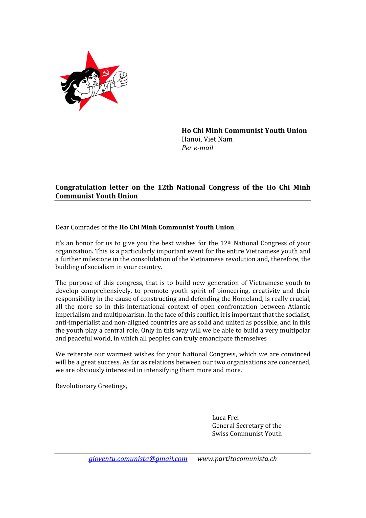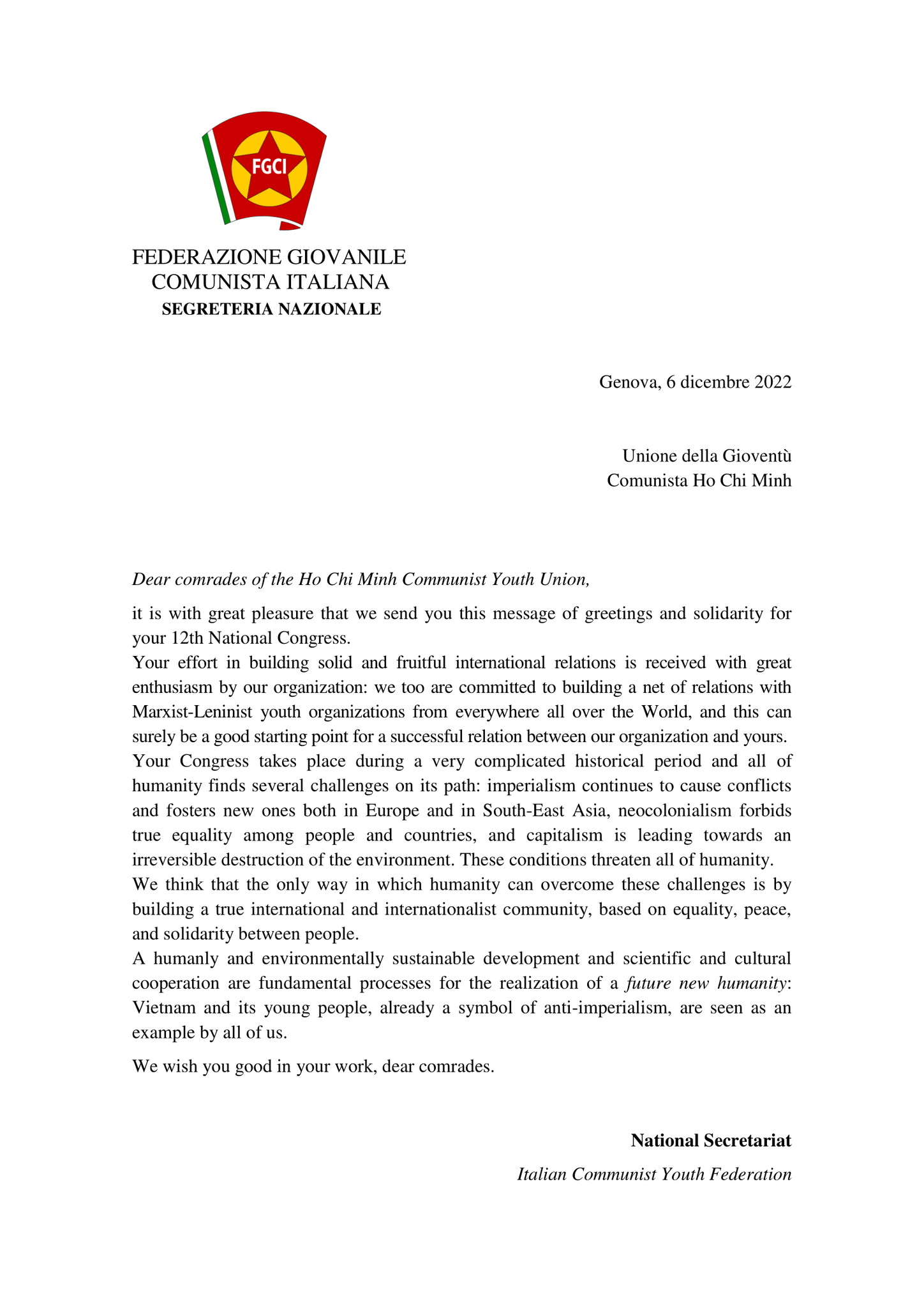 Đại hội đại biểu toàn quốc lần thứ 12 của Đoàn TNCS Hồ Chí Minh diễn ra trong một giai đoạn phức tạp khi thế giới đang đối mặt với nhiều thách thức, biến động về cả kinh tế, chính trị và chúng tôi tin tưởng rằng để vượt qua những thách thức này, các tổ chức thanh niên cần xây dựng một cộng đồng quốc tế dựa trên sự bình đẳng, hòa bình và đoàn kết. Sự phát triển bền vững về con người và môi trường và mối quan hệ hợp tác trên lĩnh vực khoa học – văn hóa là quá trình cơ bản để hiện thực hóa tương lai: Thanh niên Việt Nam – biểu tượng của chủ nghĩa chống đế quốc, là tấm gương của thanh niên Đoàn TNCS Ý.