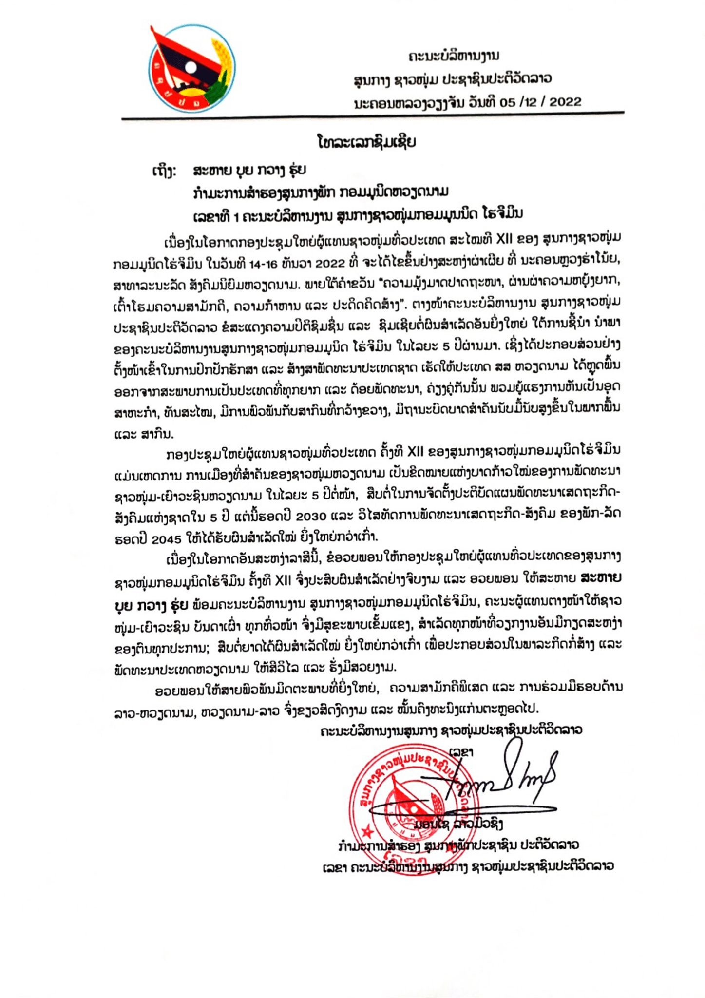 Đồng chí Bí thư Trung ương Đoàn Lào gửi lời chúc Đại hội đại biểu toàn quốc Đoàn TNCS Hồ Chí Minh lần thứ XII thành công tốt đẹp, các đại biểu đại diện cho đoàn viên, thanh niên các dân tộc Việt Nam tham dự Đại hội mạnh khỏe, làm tròn nhiệm vụ cao cả. Chúc các đồng chí tiếp tục đạt được những thành tựu mới, to lớn hơn nữa để góp phần thực hiện sứ mệnh xây dựng và phát triển đất nước Việt Nam giàu đẹp và thịnh vượng.