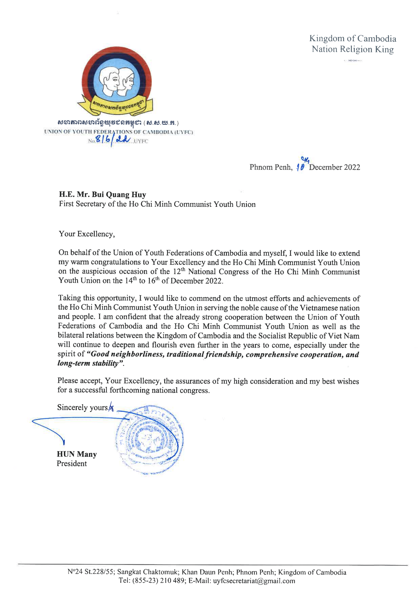 Anh Hun Many cũng khẳng định mối quan hệ hợp tác hữu nghị đặc biệt giữa Đoàn TNCS Hồ Chí Minh, Hội LHTN Việt Nam với Hội LHTN Campuchia và tin tưởng trong thời gian tới, mối quan hệ này sẽ càng được phát triển, cùng với mối quan hệ giữa nhân dân hai nước "Láng giềng tốt, Bạn bè truyền thống, Hợp tác toàn diện, Ổn định lâu dài"