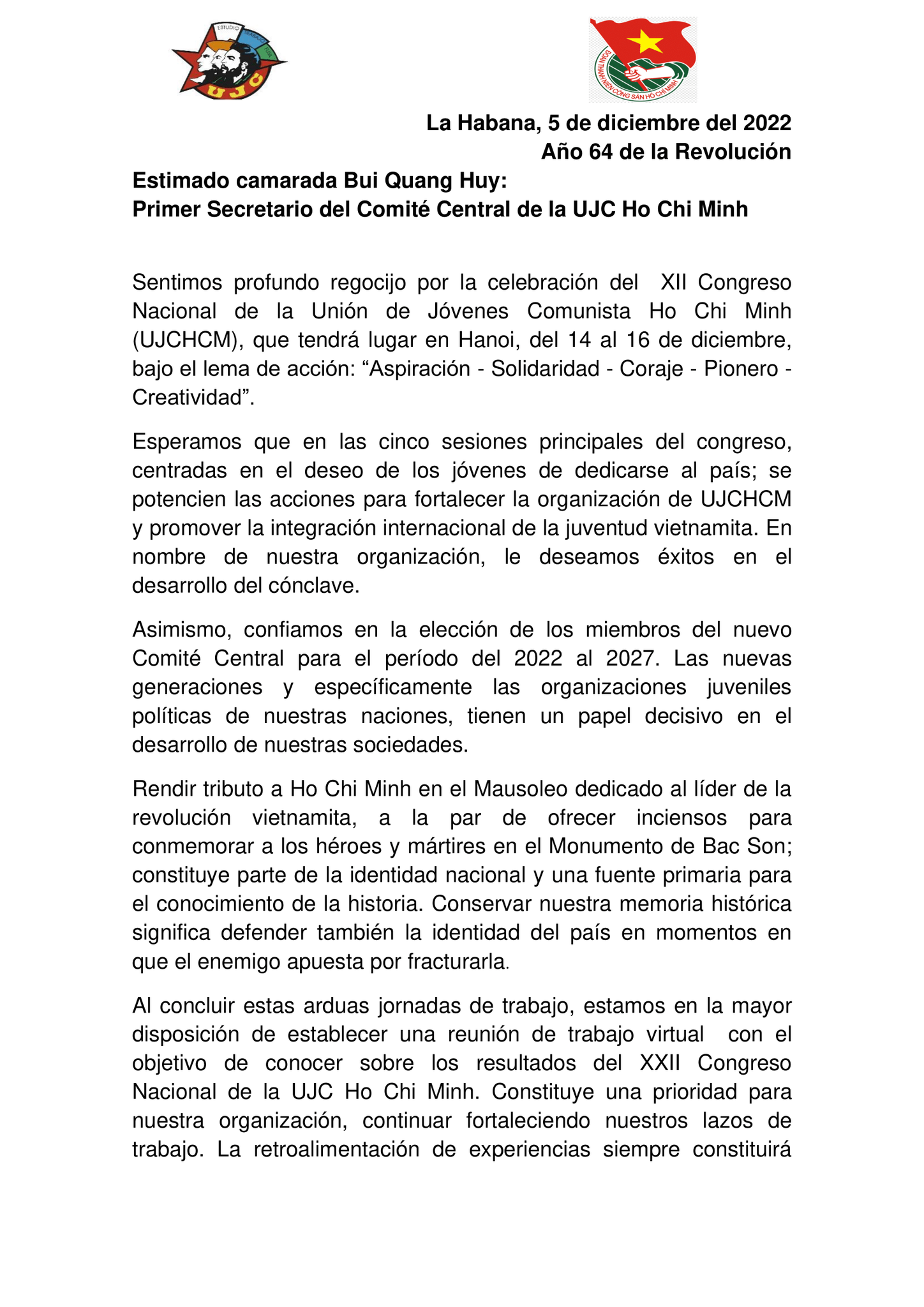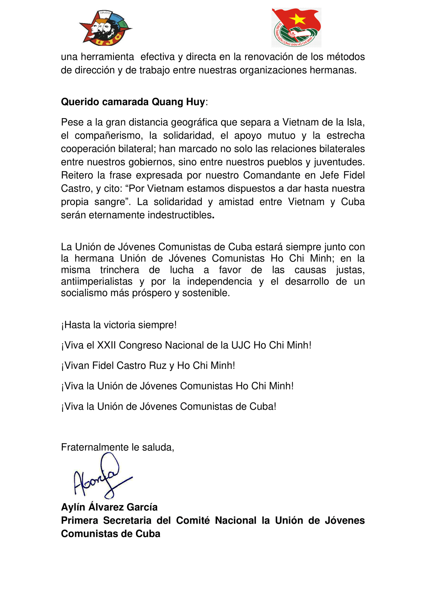Cuối thư, đồng chí nhấn mạnh rằng dù cách biệt về địa lý, mối quan hệ giữa 02 Đảng, 02 Nhà nước, 02 Đoàn Thanh niên sẽ luôn tốt đẹp, Cuba sẽ luôn sát cánh cùng Việt Nam trong công cuộc xây dựng và bảo vệ Tổ quốc.