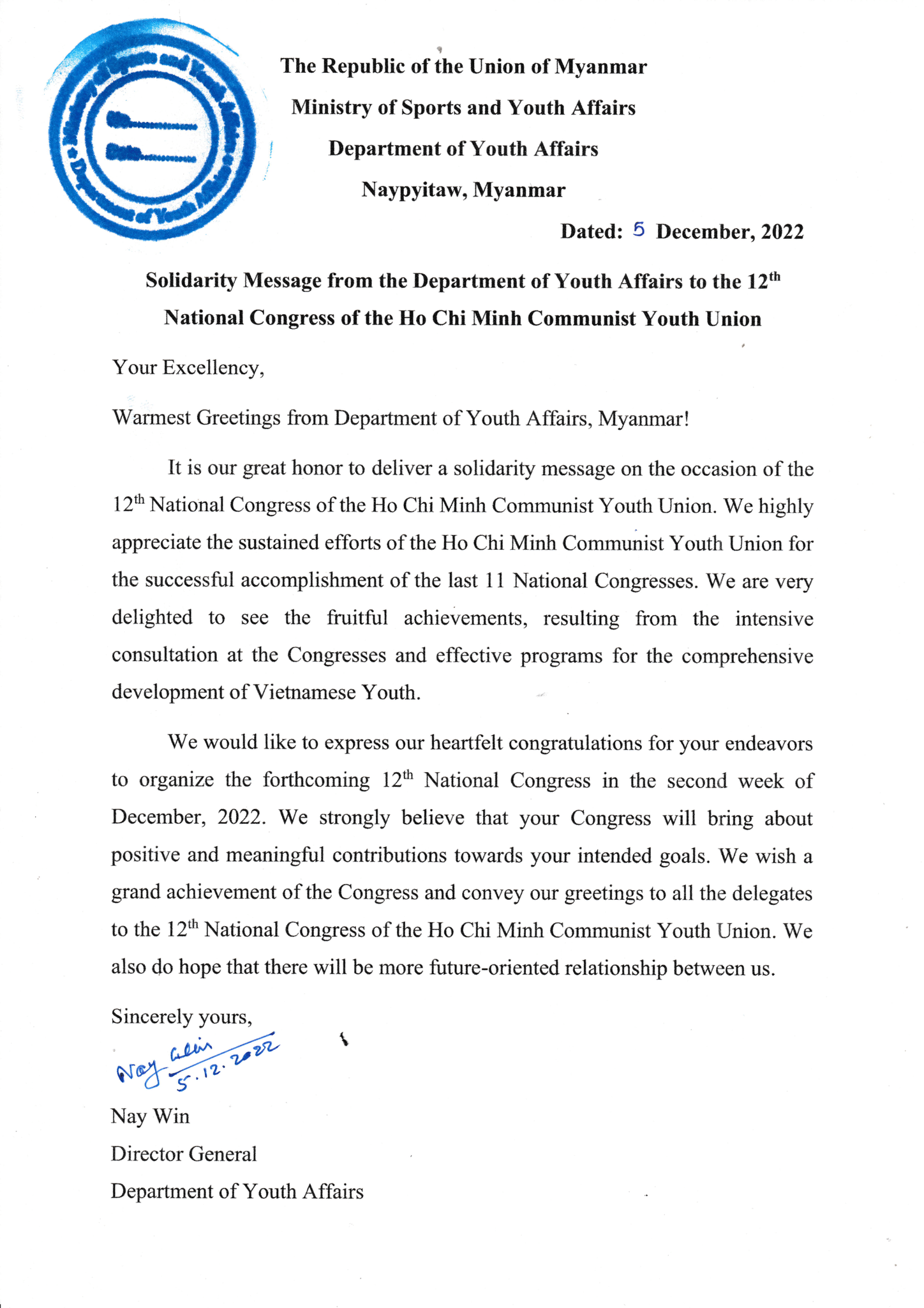 Thư chúc mừng của Bộ Thanh niên và Thể thao Myanmar.