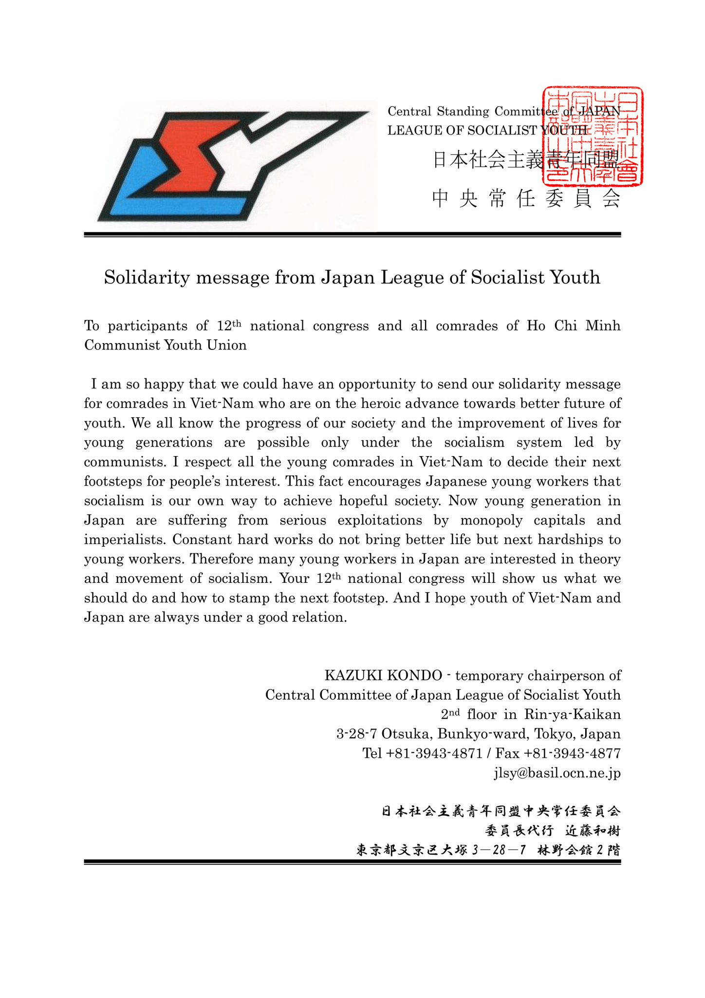 Thư chúc mừng của Đoàn Thanh niên Xã hội Nhật Bản.