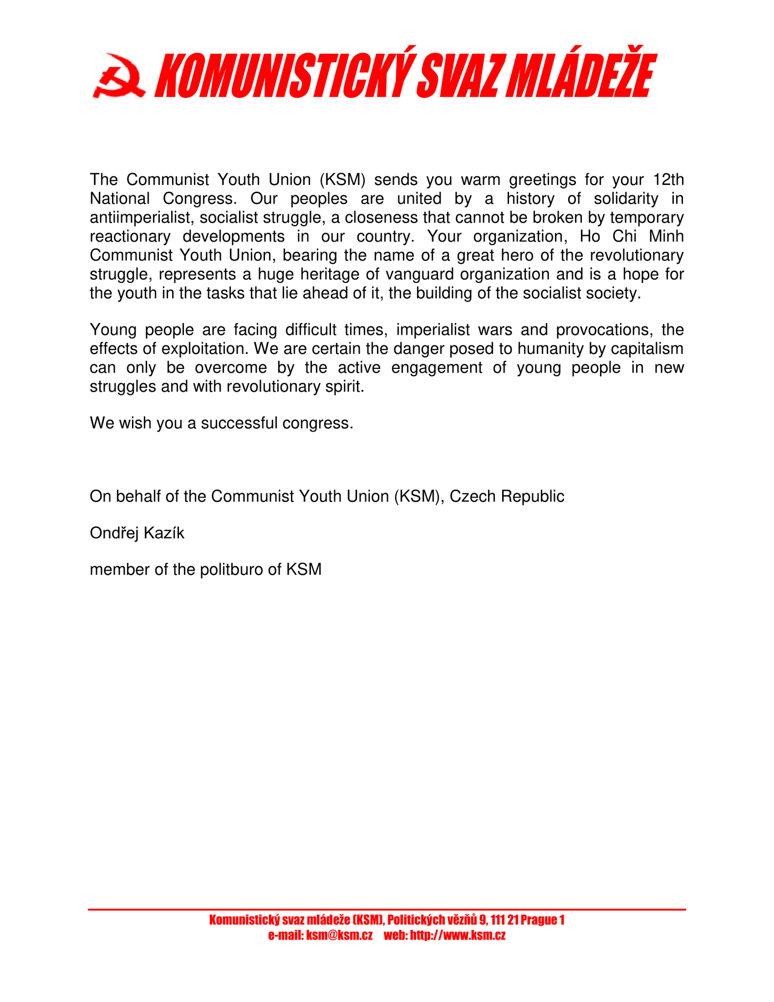 Đoàn TNCS Séc cũng nhắc lại về tình đoàn kết cũng như những sự hỗ trợ, sát cánh, giúp đỡ lẫn nhau của phong trào cánh tả cộng sản và thanh niên yêu chuộng hòa bình trên thế giới, và khẳng định sẽ tiếp tục ủng hộ lẫn nhau trong thời gian tới.