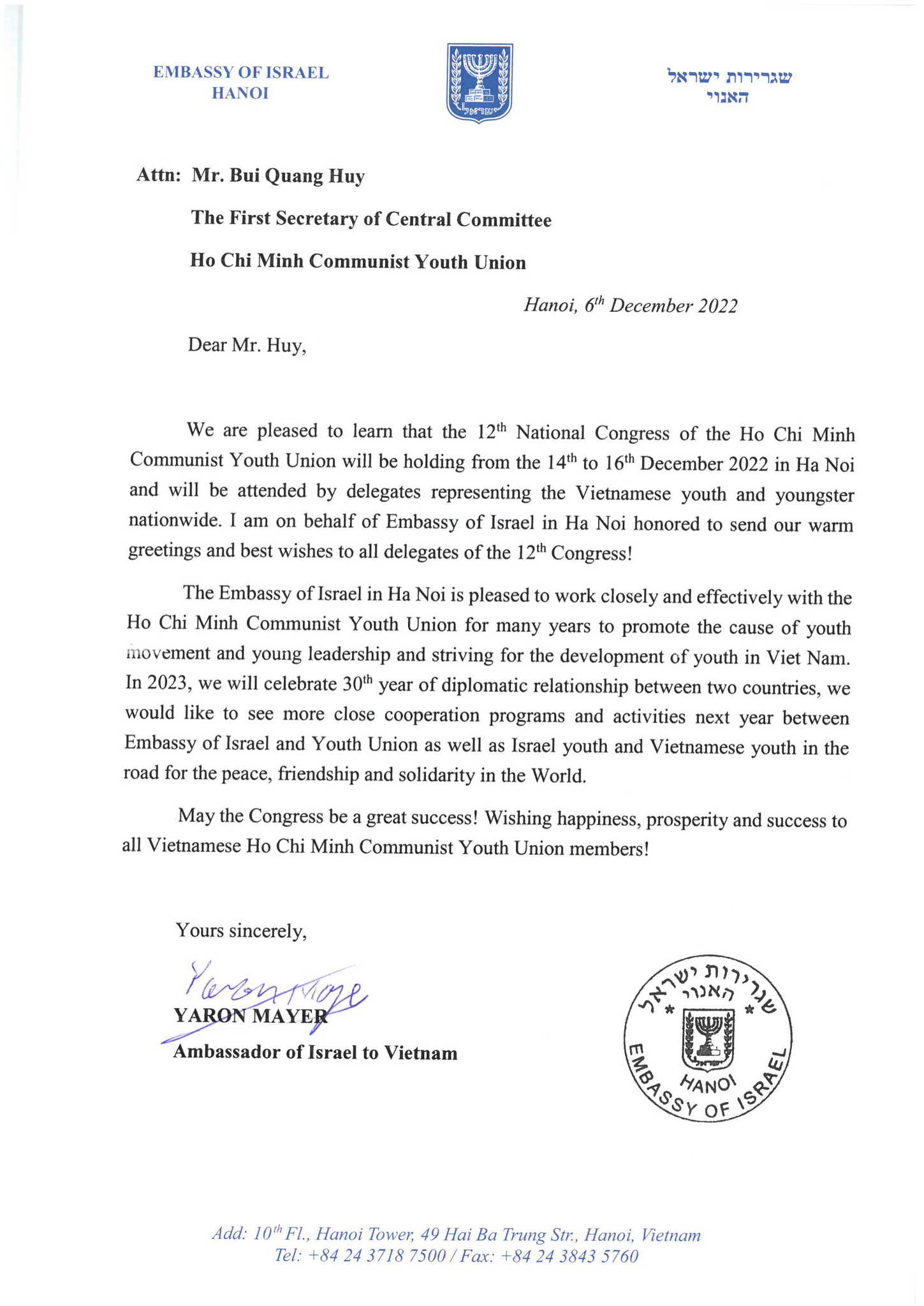 Năm 2023, hai nước sẽ kỷ niệm 30 năm thiết lập quan hệ ngoại giao. Đại sứ quán hy vọng sẽ tiếp tục được chứng kiến những chương trình và hoạt động hợp tác giữa Đại sứ quán Israel và tổ chức Đoàn, cũng như giữa thanh niên Israel và thanh niên Việt Nam, nhằm hướng tới hòa bình, hữu nghị và đoàn kết trên toàn thế giới.