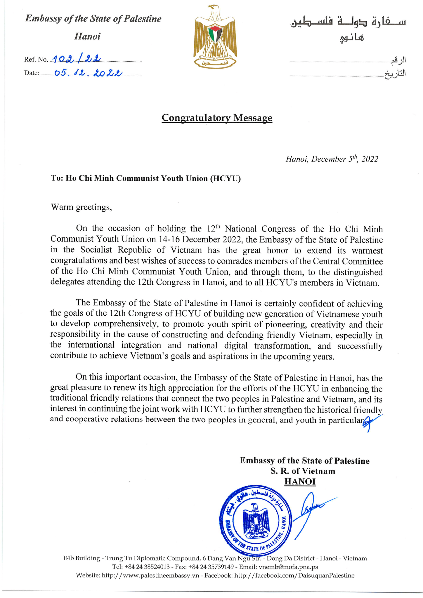 Đại sứ quán Nhà nước Israel tại Hà Nội gửi lời chúc mừng tới Đại hội và thể hiện mong muốn được hợp tác chặt chẽ và hiệu quả với Đoàn TNCS Hồ Chí Minh trong nhiều năm qua, nhằm thúc đẩy phong trào thanh niên, lãnh đạo thanh niên và nỗ lực vì sự phát triển của thanh niên Việt Nam.