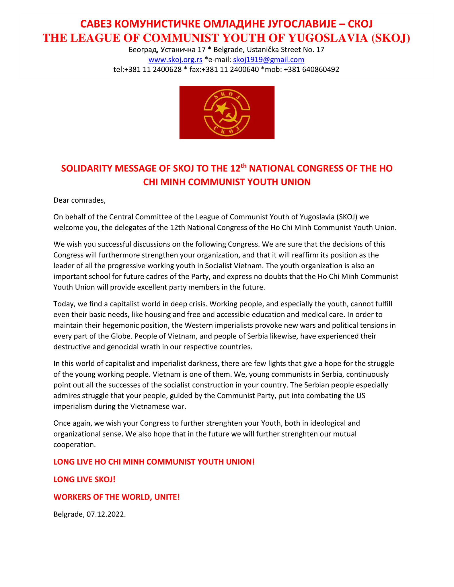 Thư chúc mừng của Liên đoàn Thanh niên Cộng sản Yogoslavia của Serbia.