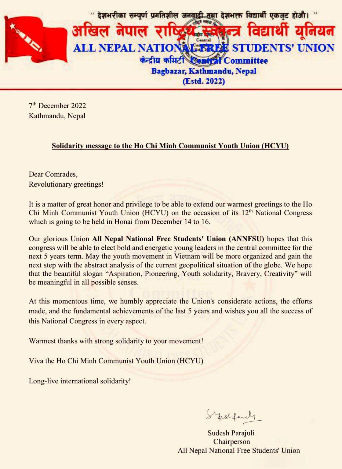 Hội Sinh viên Tự do Nepal thể hiện niềm vinh dự và tự hào được gửi lời chúc mừng nồng nhiệt nhất tới Đoàn Thanh niên Cộng sản Hồ Chí Minh nhân dịp Đại hội đại biểu toàn quốc Đoàn Thanh niên Cộng sản Hồ Chí Minh lần thứ XII, mong rằng Đại hội sẽ bầu ra các ủy viên Ban Chấp hành Trung ương Đoàn TNCS Hồ Chí Minh năng nổ và nhiệt huyết cho nhiệm kỳ 5 năm tới. Chúc cho phong trào thanh niên Việt Nam đạt được những bước phát triển mới trong bối cảnh chính trị toàn cầu hiện nay. Mong rằng khẩu hiệu cao đẹp “Khát vọng, Tiên phong, Đoàn kết, Bản lĩnh, Sáng tạo” sẽ mang đến ý nghĩa về mọi mặt.