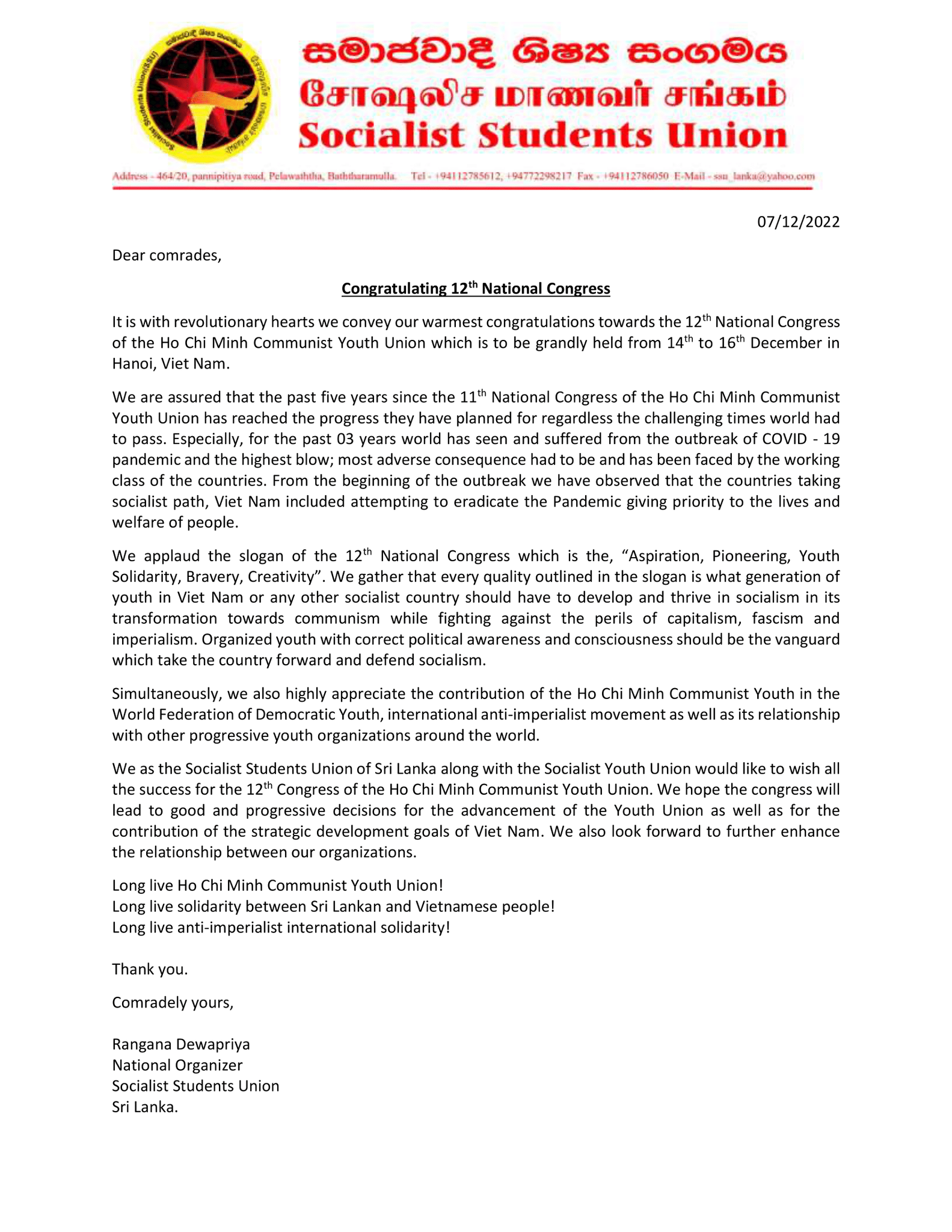 Hội Sinh viên Xã hội chủ nghĩa Sri Lanka khẳng định rằng 05 năm của Đại hội XI đã thành công rực rỡ, thu được nhiều kết quả tốt đẹp; cũng như thể hiện sự đồng tình, khen ngợi với việc lựa chọn khẩu hiệu hành động của Đại hội XII: Khát vọng - Tiên phong - Đoàn kết - Bản lĩnh - Sáng tạo. Hội Sinh viên Xã hội chủ nghĩa Sri Lanka cho rằng, đâu là khẩu hiệu mà các tổ chức thanh niên, sinh viên yêu chuộng hòa bình trên thế giới cần phải nghĩ tới, để xây dựng các thế hệ thanh niên ưu tú nhằm đóng góp vào sự phát triển của các tổ chức thanh niên tiến bộ trên thế giới.