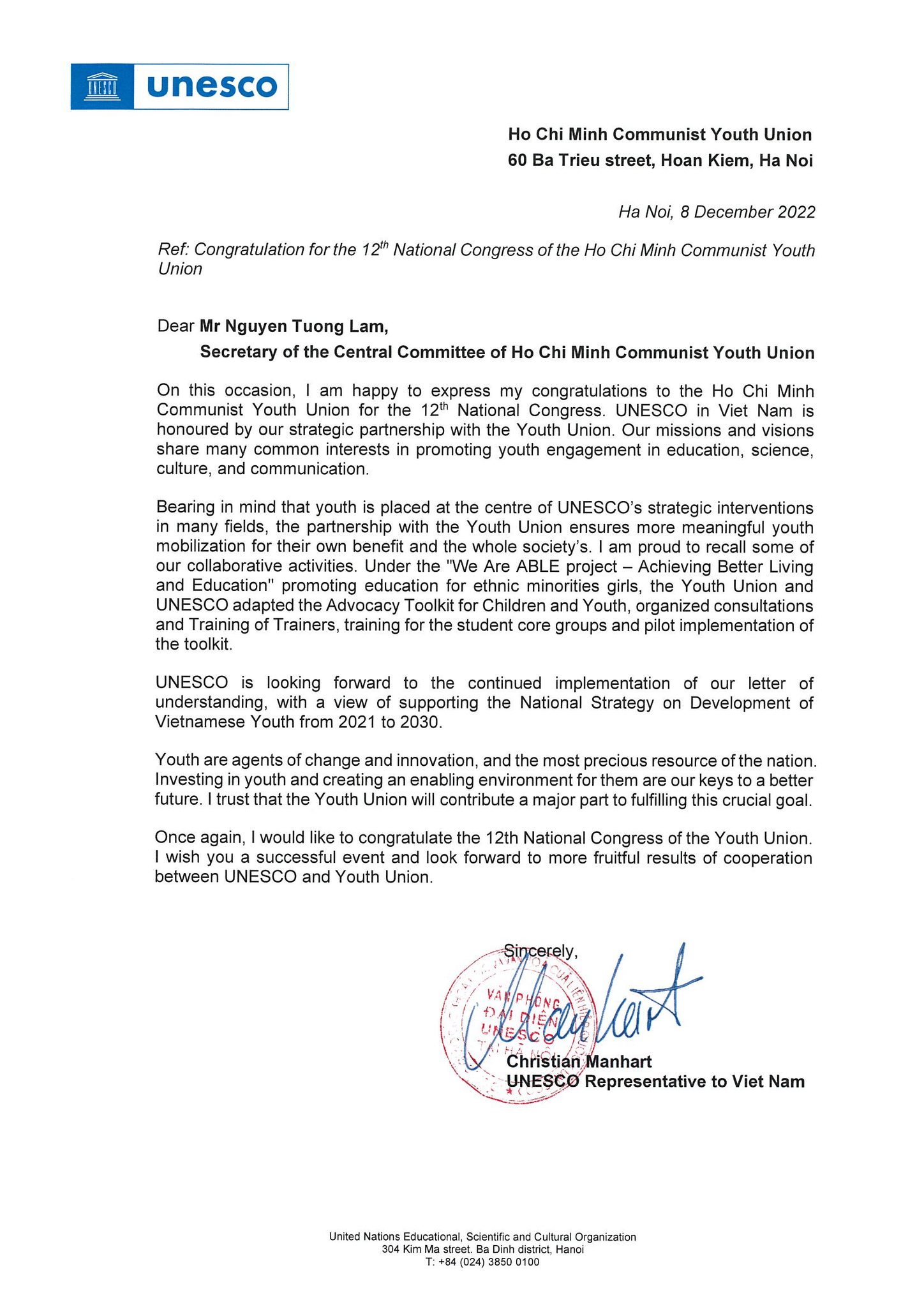 UNESCO tại Việt Nam chúc mừng Đại hội XII và chia sẻ những điểm chung của 02 tổ chức trong việc đồng hành, hỗ trợ và phát triển thanh niên Việt Nam.
