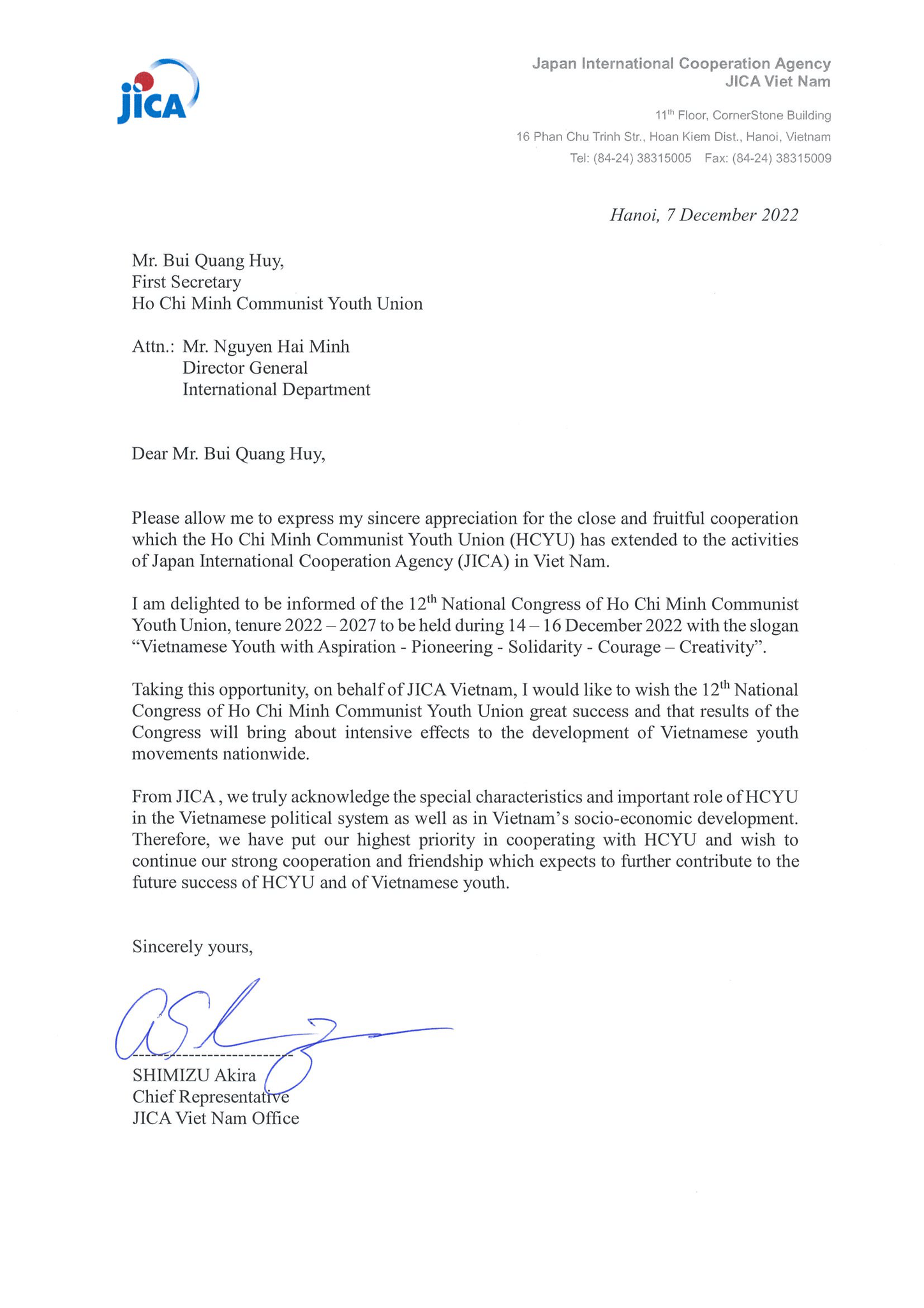 Văn phòng JICA tại Việt Nam gửi lời chúc mừng tới Đại hội XII, đồng thời khẳng định vai trò quan trọng, to lớn của tổ chức Đoàn trong việc dẫn dắt thế hệ trẻ Việt Nam trong sự nghiệp bảo vệ và phát triển đất nước, và mong muốn thanh niên hai nước sẽ có nhiều cơ hội hợp tác trong thời gian tới.