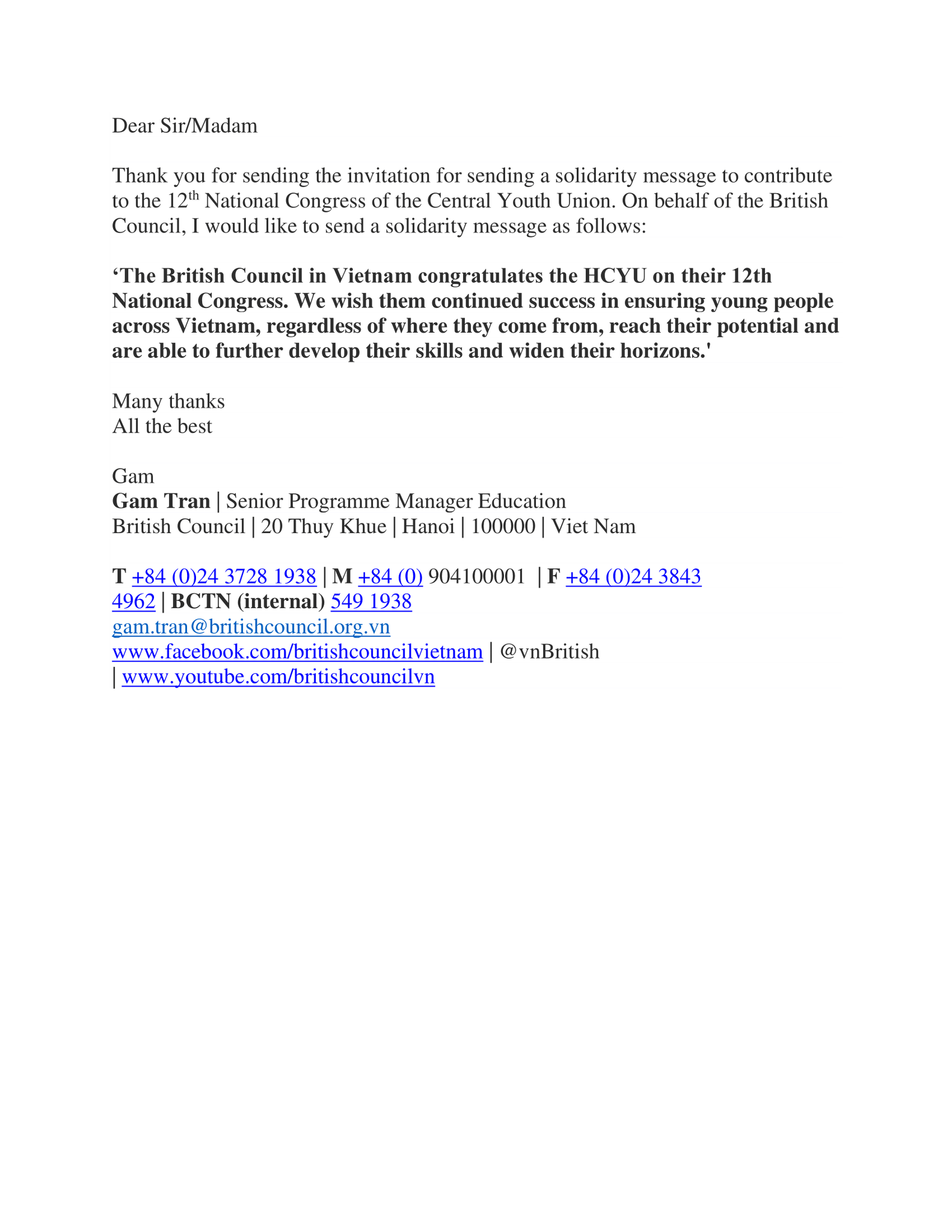 Hội đồng Anh tại Việt Nam chúc mừng HCYU nhân Đại hội đại biểu toàn quốc lần thứ XII, chúc Đoàn Thanh niên tiếp tục thành công trong việc khuyến khích và đồng hành với những người trẻ tuổi trên khắp Việt Nam, bất kể họ đến từ đâu, nhằm phát huy hết tiềm năng của mình và có thể phát triển hơn nữa các kỹ năng cũng như mở rộng tầm nhìn.