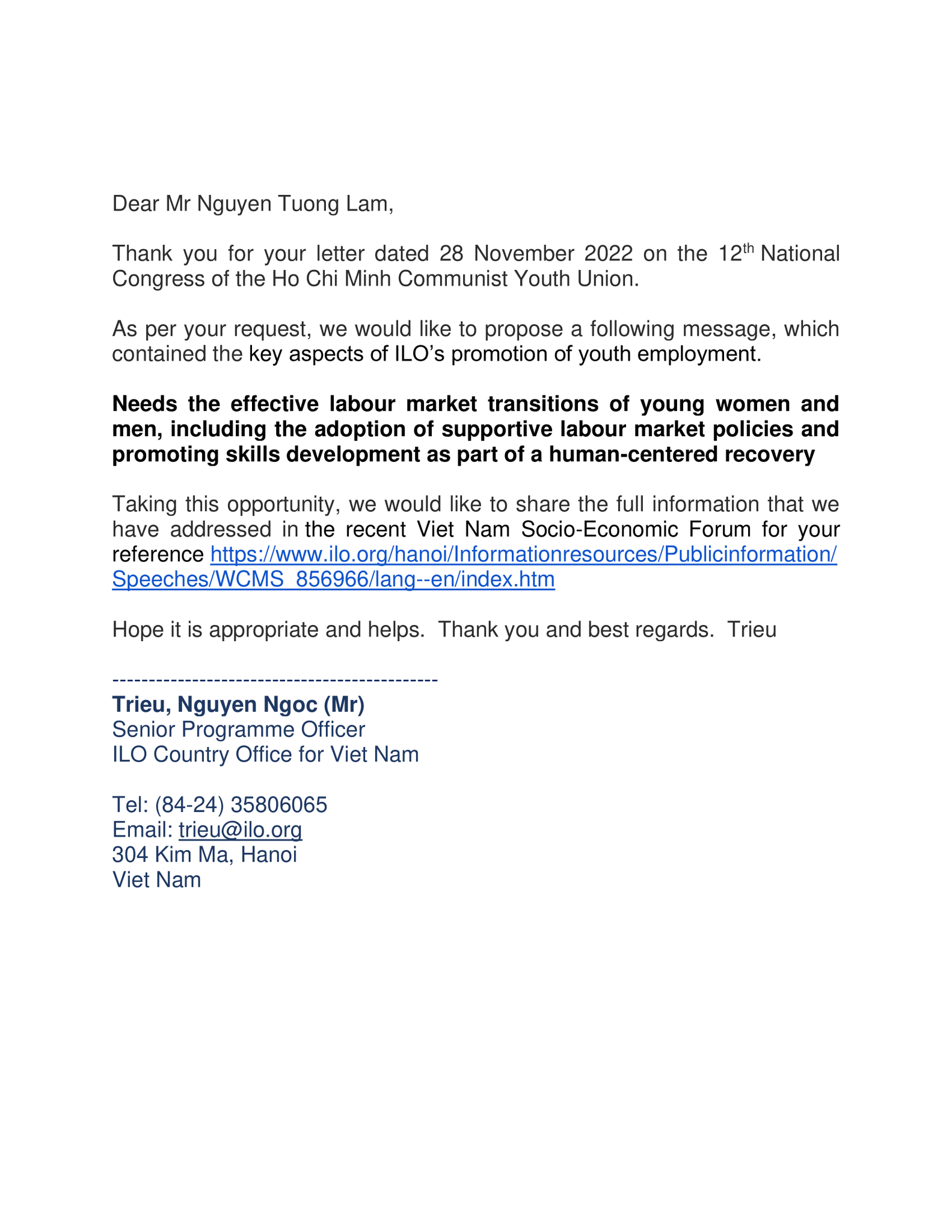 Tổ chức ILO Việt Nam gửi một thông điệp tới Đại hội Đoàn XII: Cần chuyển đổi thị trường lao động hiệu quả cho nam và nữ thanh niên, bao gồm việc áp dụng các chính sách hỗ trợ thị trường lao động và thúc đẩy phát triển kỹ năng như một phần của quá trình phục hồi lấy con người làm trung tâm.