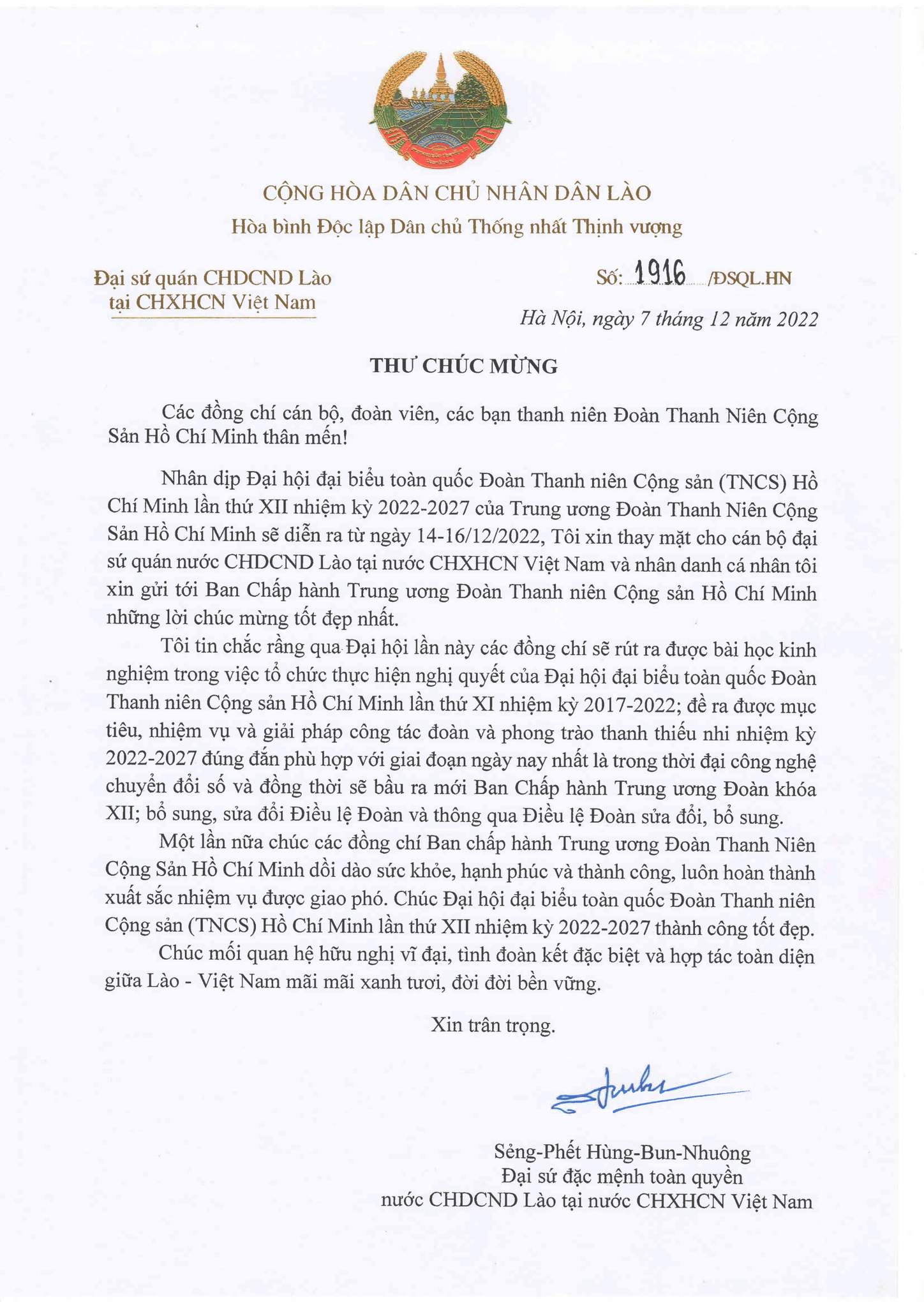 Thư chúc mừng của đồng chí Đại sứ đặc mệnh toàn quyền nước Cộng hòa Dân chủ nhân dân Lào tại Việt Nam và tập thể Đại sứ quán Lào tại Việt Nam.