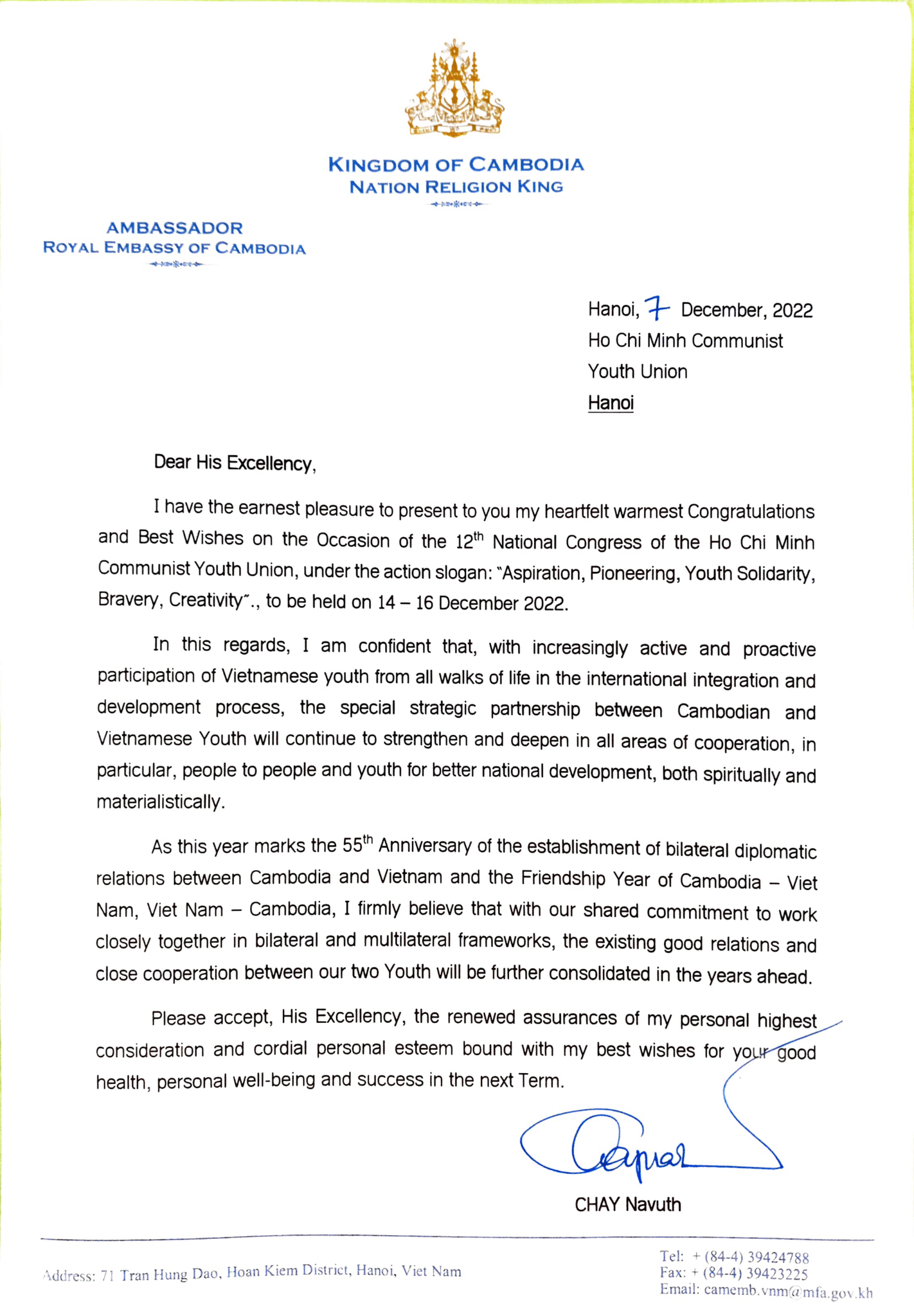 Ngài CHAY Navuth, Đại sứ đặc mệnh toàn quyền Vương quốc Campuchia tại Việt Nam đã gửi những lời chúc mừng tốt đẹp nhất tới Đại hội, đồng thời nhấn mạnh mối quan hệ tốt đẹp giữa hai nước Việt Nam - Campuchia, đặc biệt trong năm 2022, năm đánh dấu 55 năm ngày thiết lập quan hệ ngoại giao Việt Nam - Campuchia.
