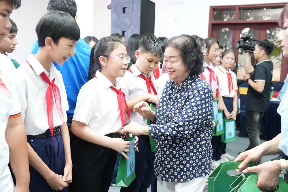 Bí thư T.Ư Đoàn, Chủ tịch Hội đồng Đội Trung ương Nguyễn Phạm Duy Trang trao tặng quà cho các em thiếu mhi