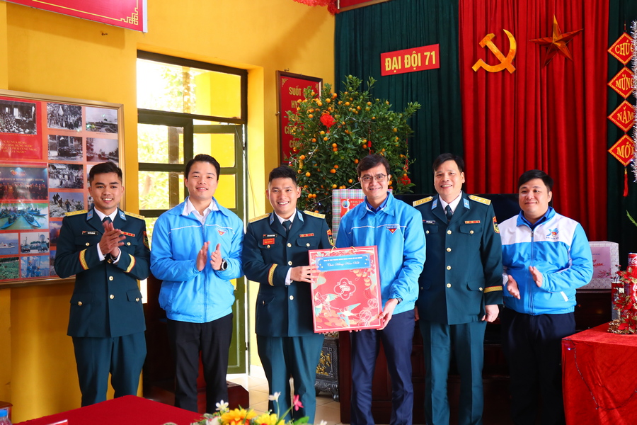 Đồng chí Nguyễn Thái An, Trưởng Ban Tuyên giáo Trung ương Đoàn lì xì may mắn cho các cán bộ, chiến sỹ Đại đội 71, Trung đoàn 280, Sư đoàn 361, Quân chủng Phòng không - Không quân.