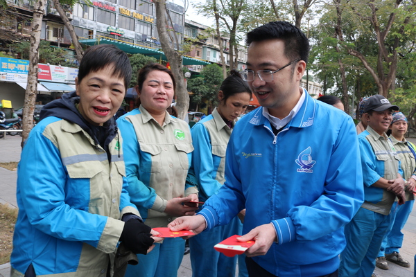 Đồng chí Nguyễn Tường Lâm thăm, chúc Tết đội công nhân thuộc Công ty TNHH MTV Môi trường Đô thị quận Long Biên tại Vườn hoa phố Ngọc Lâm (Hà Nội)