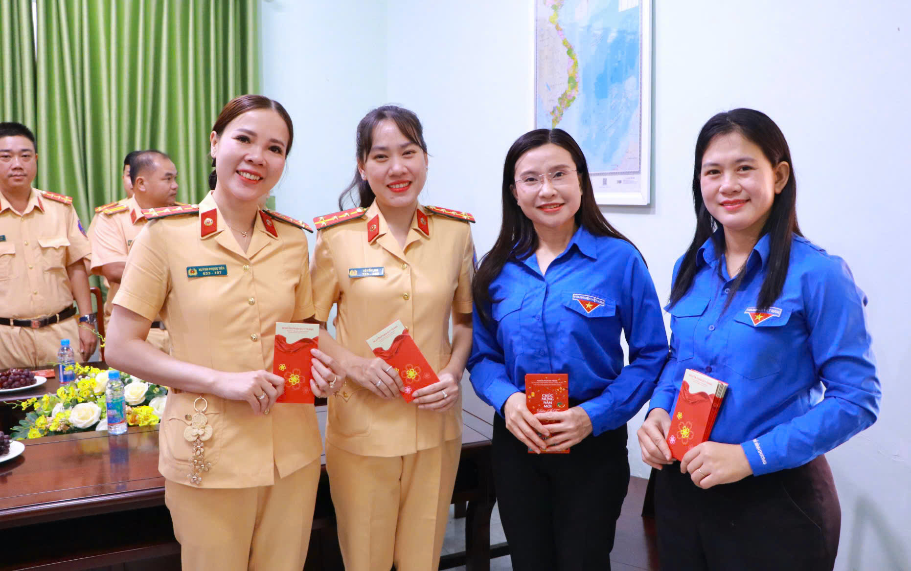 Đồng chí Nguyễn Phạm Duy Trang, Bí thư Trung ương Đoàn lì xì chúc Tết cán bộ, chiến sĩ bảo vệ an ninh trật tự