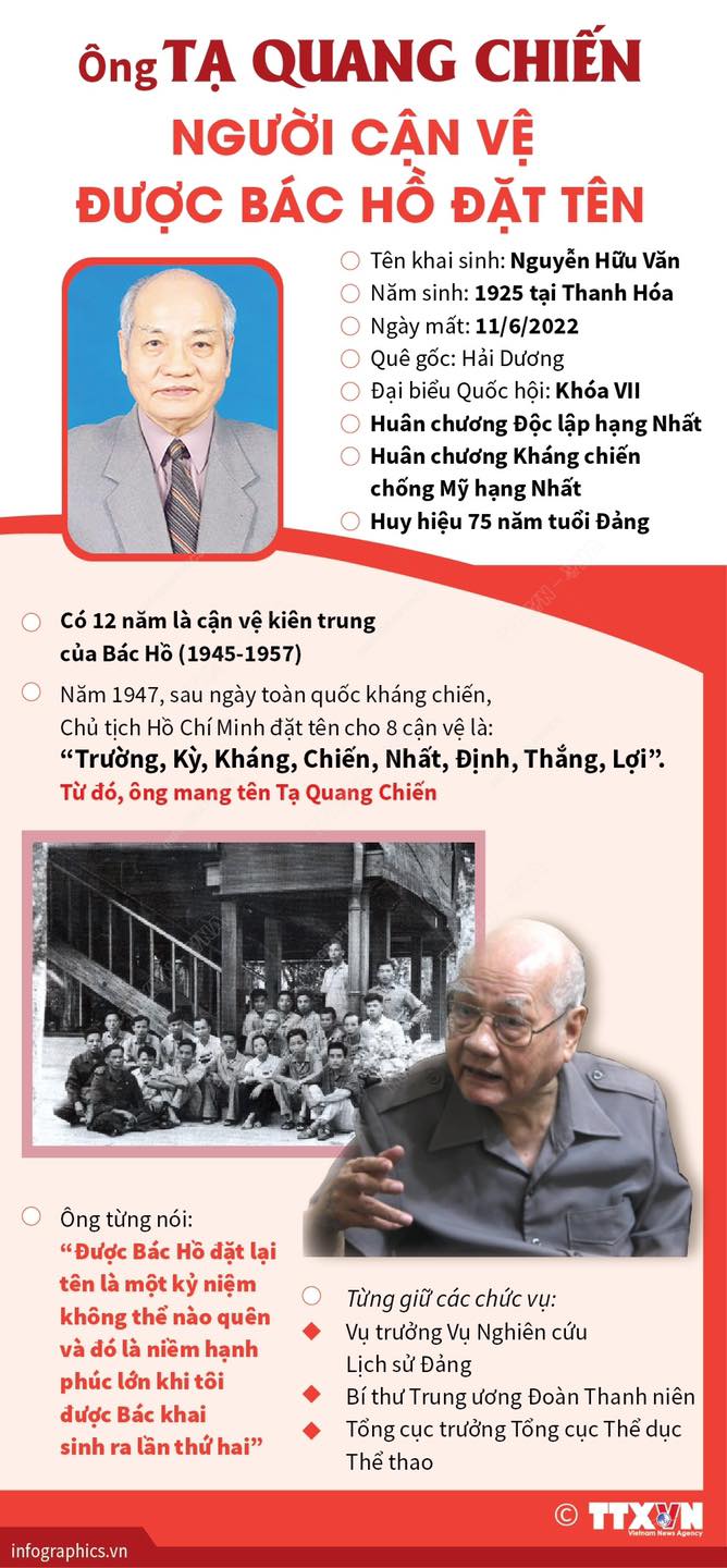 Đồng chí Tạ Quang Chiến (tên thật là Nguyễn Hữu Văn) sinh năm 1925 tại tỉnh Thanh Hóa, thường trú tại phường Điện Biên, quận Ba Đình, Hà Nội. Trong sự nghiệp, đồng chí Tạ Quang Chiến từng có 12 năm là cận vệ của Bác Hồ. Đồng chí cũng vinh dự là một trong 8 chiến sĩ cận vệ được Bác Hồ đặt tên gồm: Trường, Kỳ, Kháng, Chiến, Nhất, Định, Thắng, Lợi. Từ năm 1960, đồng chí làm Vụ trưởng vụ Nghiên cứu Lịch sử Đảng, Bí thư T.Ư Đoàn Thanh niên… Từ năm 1981 đến năm 1992, đồng chí làm Tổng cục trưởng Tổng cục Thể dục thể thao. Đồng chí cũng là Đại biểu Quốc hội khóa VII (1981 - 1987). Đồng chí được tặng Huân chương Độc lập hạng Nhất, Huân chương chống Mỹ hạng Nhất, Huy hiệu 75 tuổi Đảng.