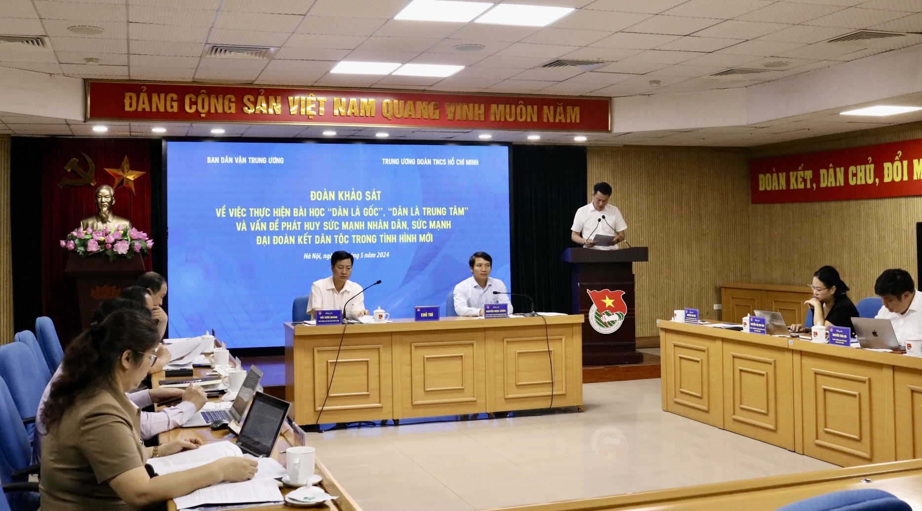 Phát biểu tại chương trình, đồng chí Bùi Tuấn Quang, Phó trưởng Ban Dân vận Trung ương cho biết để chuẩn bị văn kiện Đại hội XIV của Đảng, Ban Dân vận T.Ư được giao thực hiện đề tài khảo sát việc thực hiện bài học "Dân là gốc", "Dân là trung tâm" và vấn đề phát huy sức mạnh nhân dân, sức mạnh đại đoàn kết dân tộc trong tình hình mới. Thực hiện kế hoạch này, Ban Dân vận T.Ư khảo sát một số cơ quan, bộ, ngành địa phương, trong đó có T.Ư Đoàn. Qua đó sẽ chắt lọc vấn đề liên quan gửi báo cáo tới Bộ Chính trị và xây dựng văn kiện Đại hội Đảng.