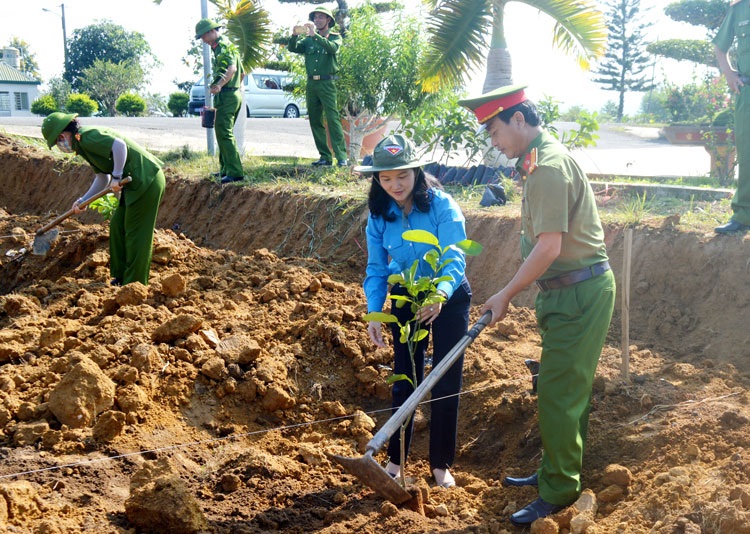Bí thư Tỉnh Đoàn Lâm Đồng Trần Thị Chúc Quỳnh và Ban Giám thị Trại giam Đại Bình trồng bưởi da xanh tại “Vườn cây sinh kế”